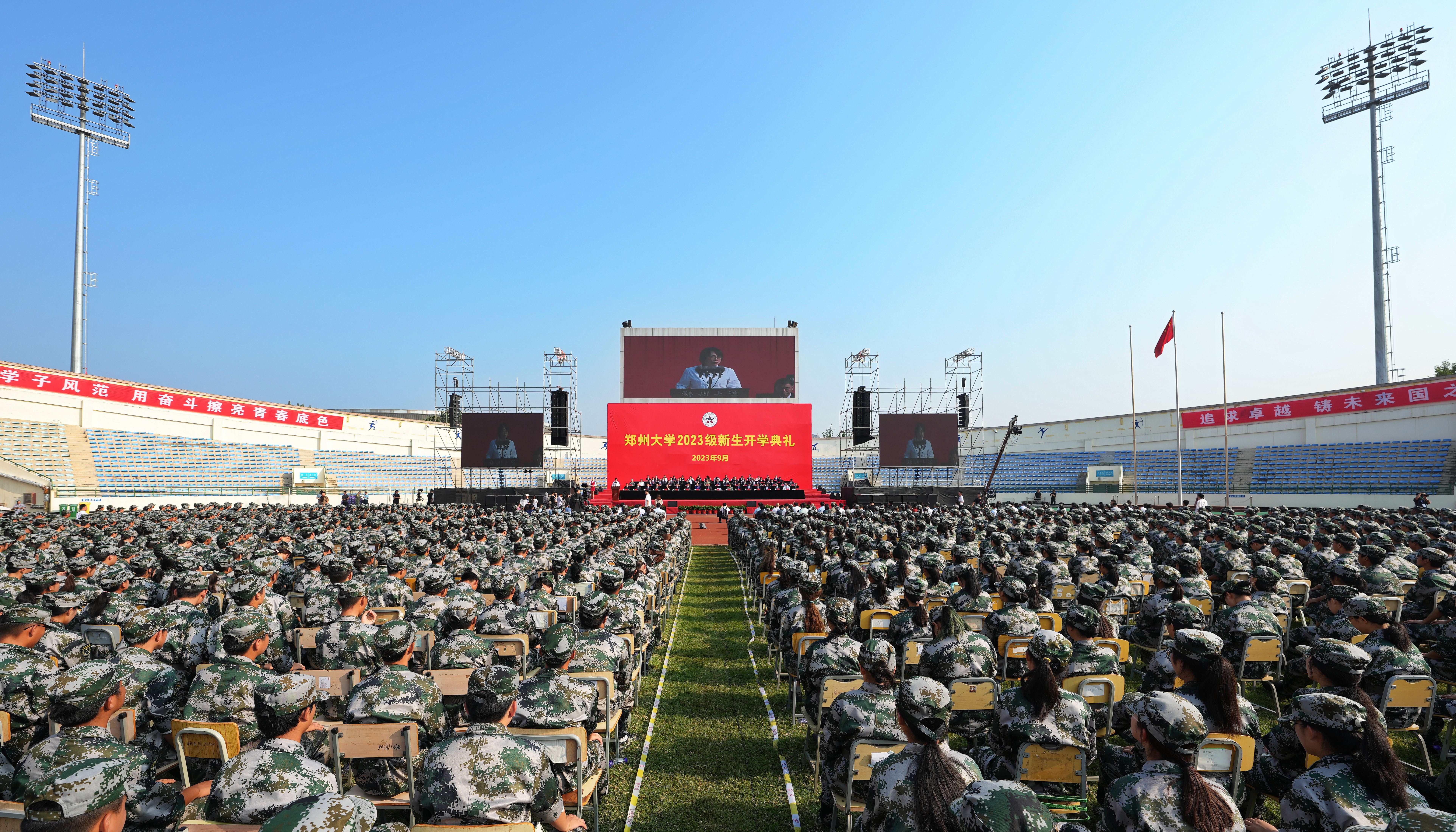 砥砺逐梦迎新季,扬帆再起展新程。9月15日,pp电子官方网站2023级新生开学典礼在主校区本源体育场举行。特邀嘉宾、英雄航天员、中国首位进入太空的女航天员刘洋,河南省军区政治工作局大校副主任宋平,日本工程院院士、网络空间安全学院物联网工程学科方向带头人李颉,校友代表、清华大学水利水电工程系教授、水沙科学与水利水电工程国家重点实验室主任李庆斌,解放军陆军第83集团军杨根思部队副参谋长、pp电子官方网站军训团副团长齐琛,pp电子官方网站优质生源基地中学校长代表,承训部队83集团军杨根思部队承训官兵,校领导别荣海、李蓬、常俊标、吴宏阳、韩国河、张倩红、许东升、单崇新、胡少伟、徐东升、刘春太,学术副校长董子钢、赵中伟,学术副校长、第一附属医院院长姜勇,校部机关和各院系主要负责同志,教师代表和2023级全体新生共同参加了活动。校党委副书记吴宏阳主持典礼。