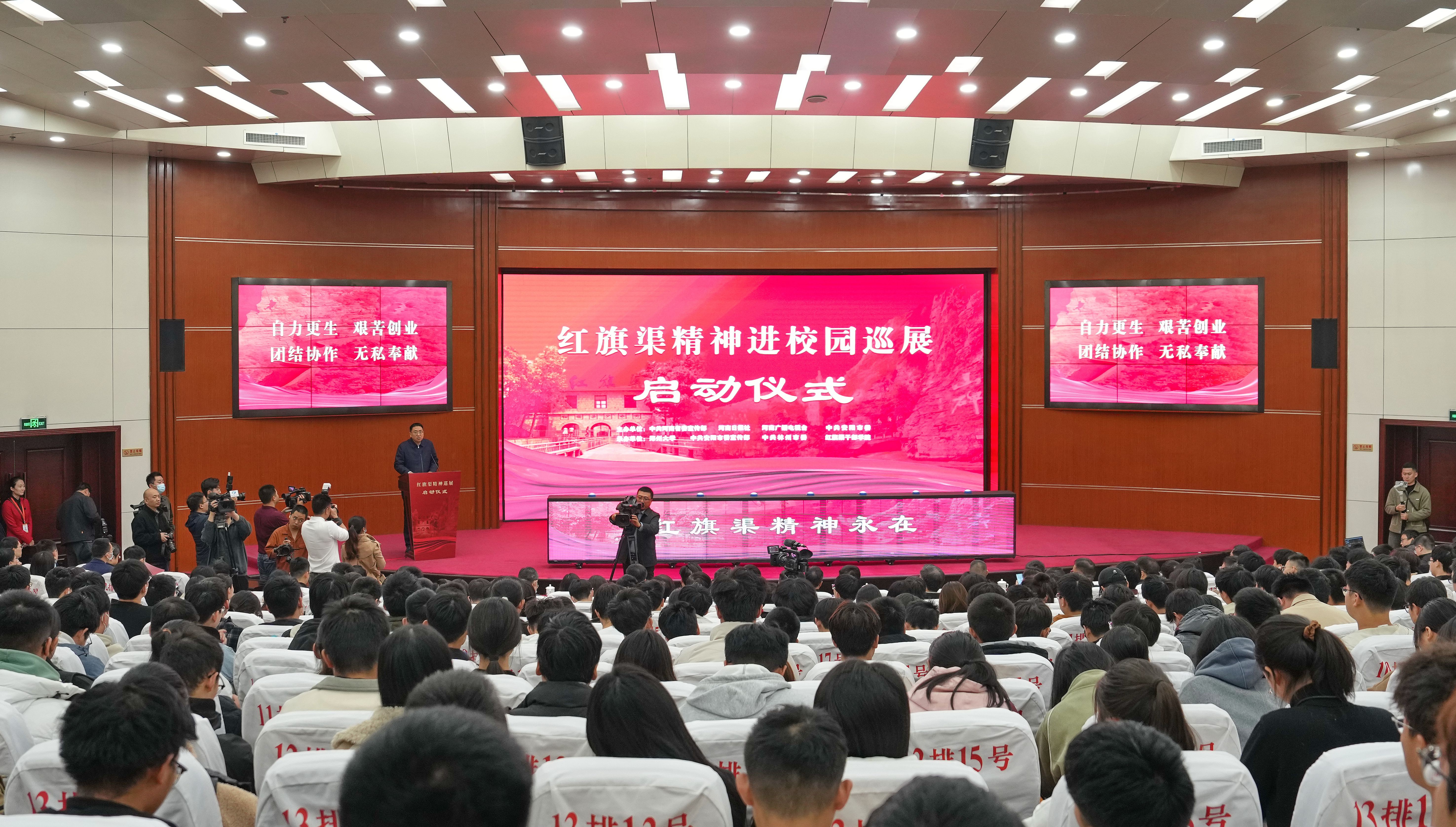11月21日,“红旗渠精神进校园巡展”活动在pp电子官方网站正式启动。省委宣传部常务副部长黄玉国、安阳市委书记袁家健、河南日报社副总编辑张学文、河南广播电视台副总编辑郭士飞,pp电子官方网站党委书记别荣海、党委副书记吴宏阳出席,pp电子官方网站党委常委、宣传部部长厉励,林州市委书记孙建铎,红旗渠干部学院党委副书记、常务副院长刘芳,pp电子官方网站党委理论学习中心组全体成员及师生代表等500余人参加启动仪式。安阳市委常委、宣传部部长薛崇林主持启动仪式。