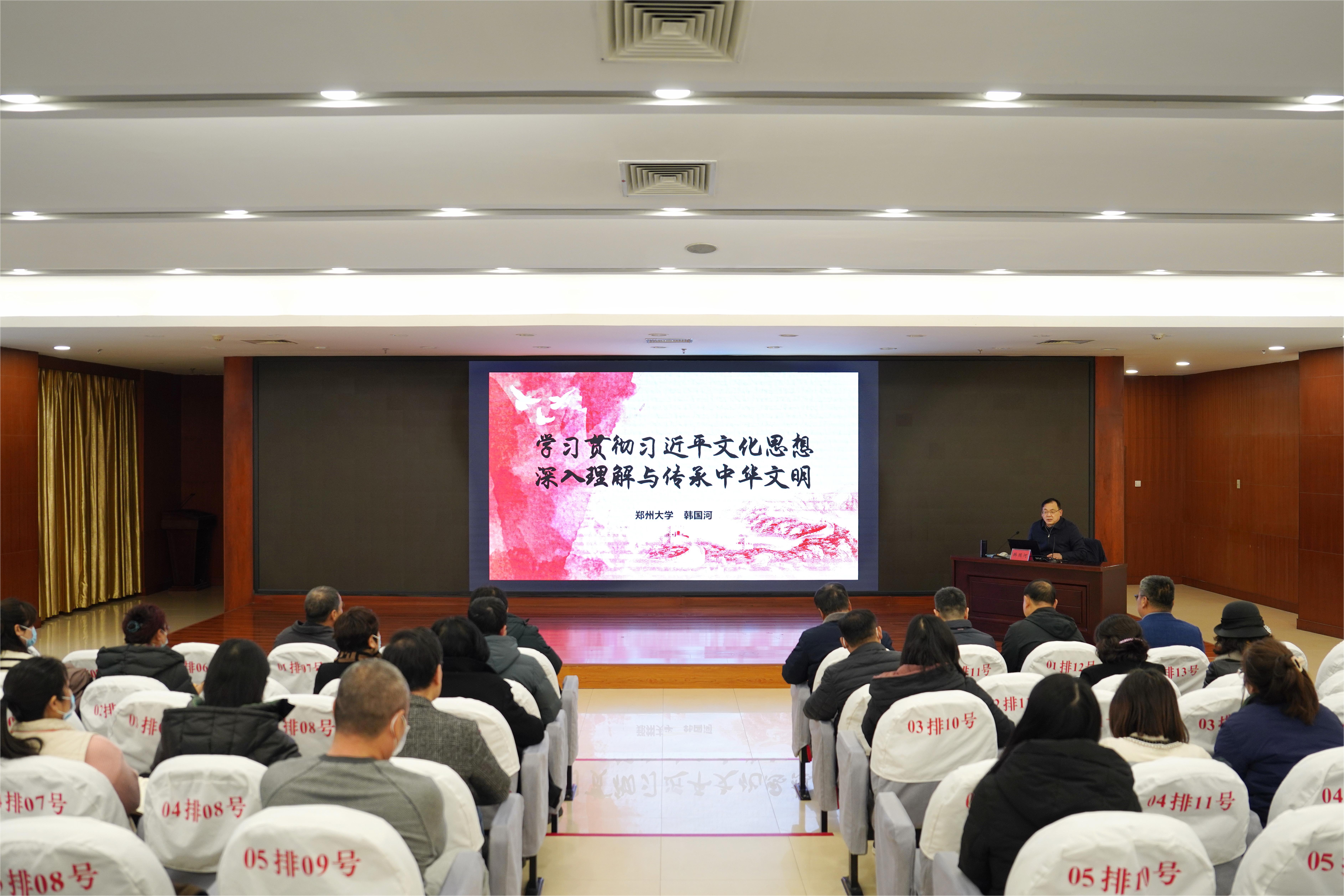 韩国河以《学习贯彻习近平文化思想 深入理解与传承中华文明》为题,围绕习近平文化思想的主要内容、中华文明发展史、中华文明的特性、考古学的重大政治意义四个方面进行了深入解读。他指出,习近平文化思想植根中华文化沃土,突出强调中华文明的连续性,高度重视推进中华文明探源工程,我们要立足我国百万年的人类史、一万年的文化史、五千多年的文明史,从源远流长的历史连续性来认识中国、认识博大精深的中华文明。他详细阐释了中华文明所具有的连续性、创新性、统一性、包容性及和平性五大特性,并强调考古学在揭示中华文明起源和发掘传承中华优秀传统文化等方面具有独特作用和重大社会政治意义:一是揭示中华文明起源与发展历史脉络,展示中华文明重大贡献;二是增强民族凝聚力,坚定文化自信;三是传承中华文明,丰富历史文化滋养。