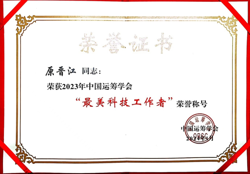 运筹帷幄之中,决胜千里之外。中国运筹学会(原名中国数学会运筹学分会)起源于1980年,第一届理事长为华罗庚先生。中国运筹学会现为国家一级学会,是运筹学工作者的学术性团体组织。现有专业委员会16个、个人会员2000多人、团体会员30个,集中了全国运筹学最优秀的科研人员。中国运筹学会“最美科技工作者”每年评选一次,每次获奖两人,旨在深入宣传中国运筹学会科研人员中的先进典型,激励其他运筹学工作者,为我国社会经济的发展做出应有的贡献。本次原晋江教授获此殊荣是中国运筹学界对原晋江教授科研工作的认可,也是学校的荣誉。