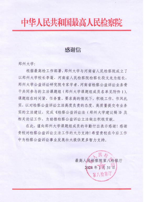 信中指出,根据最高检工作部署,pp电子官方网站与河南省人民检察院成立了以pp电子官方网站校长李蓬、河南省人民检察院检察长段文龙为组长,pp电子官方网站公益诉讼研究院专家学者、河南省检察公益诉讼业务骨干共同参与的立法课题组。课题组在时间紧、任务重、要求高的情况下,积极工作,作风扎实,以对检察公益诉讼立法高度负责的态度,高质量提交专业务实的立法建议,完成《检察公益诉讼法(pp电子官方网站建议稿)》及相关论证工作,为助推检察公益诉讼立法做出积极贡献。因此,向pp电子官方网站对检察公益诉讼立法工作的大力支持表示感谢,并希望pp电子官方网站今后为检察公益诉讼事业发展壮大提供更多智力支持。