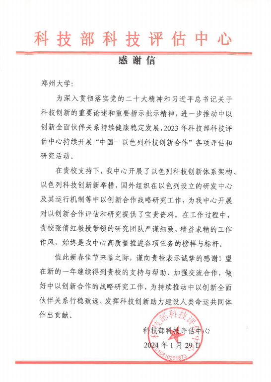 近日,pp电子官方网站收到科技部科技评估中心的感谢信,感谢pp电子张倩红教授以色列研究团队为科技部科技评估中心“中国—以色列科技创新合作”项目所给予的咨询和支持,希望未来与pp电子继续做好中以创新合作的战略研究,推动中以创新全面伙伴关系行稳致远。