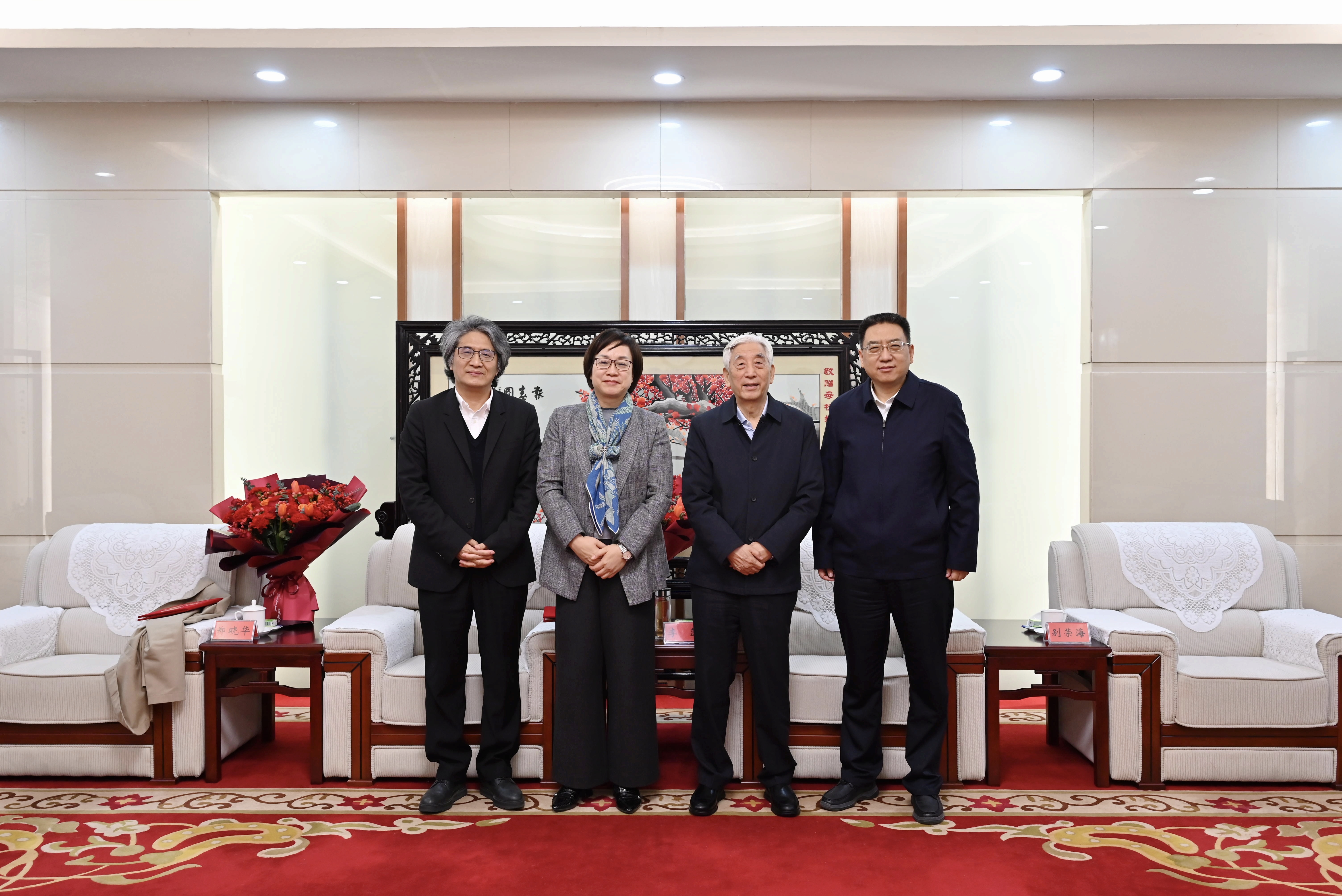 校党委书记别荣海(右一)、校长李蓬院士(左二)与张海先生(右二)、郑晓华先生(左一)合影