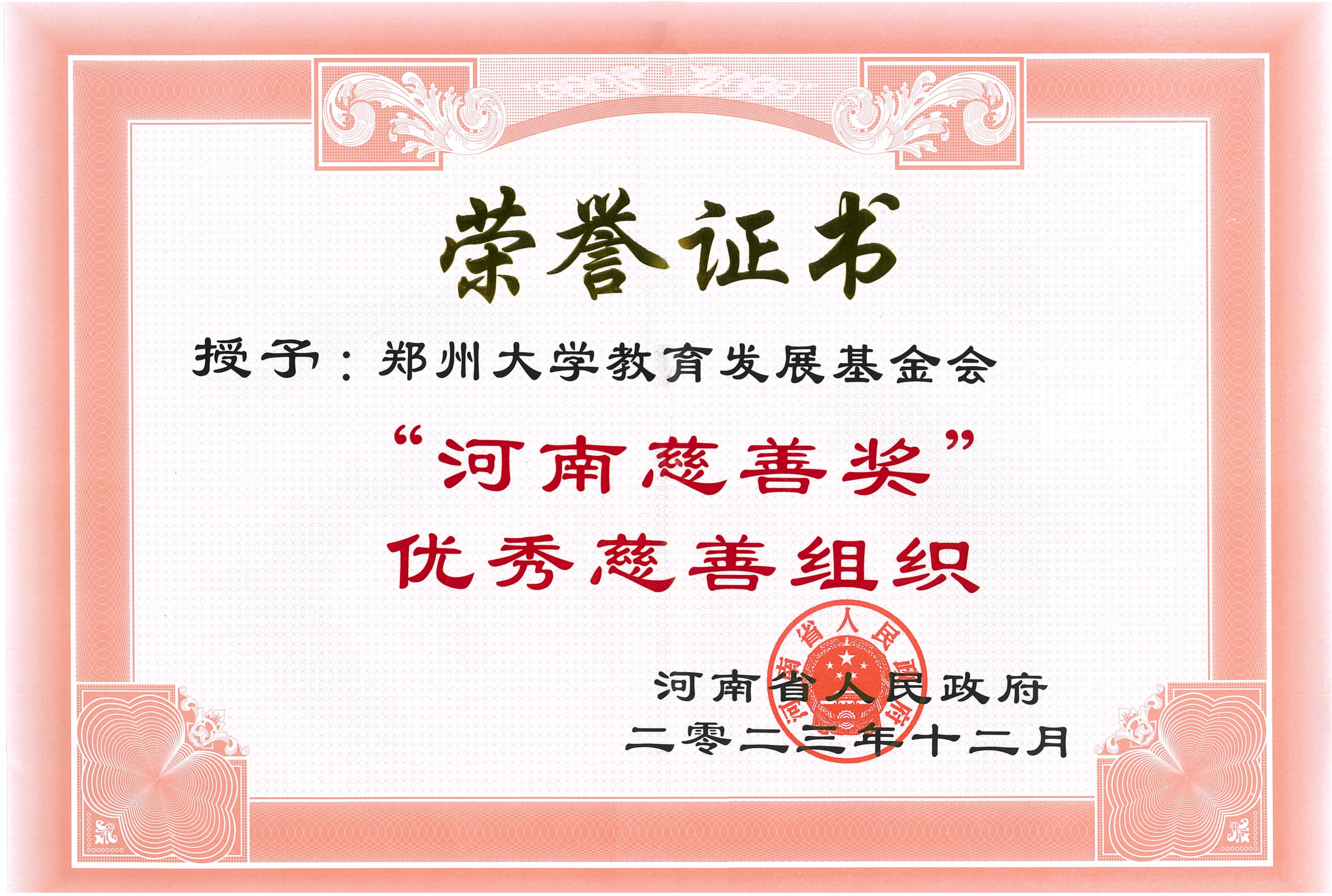 pp电子官方网站教育发展基金会荣获“河南慈善奖”“优秀慈善组织”荣誉证书