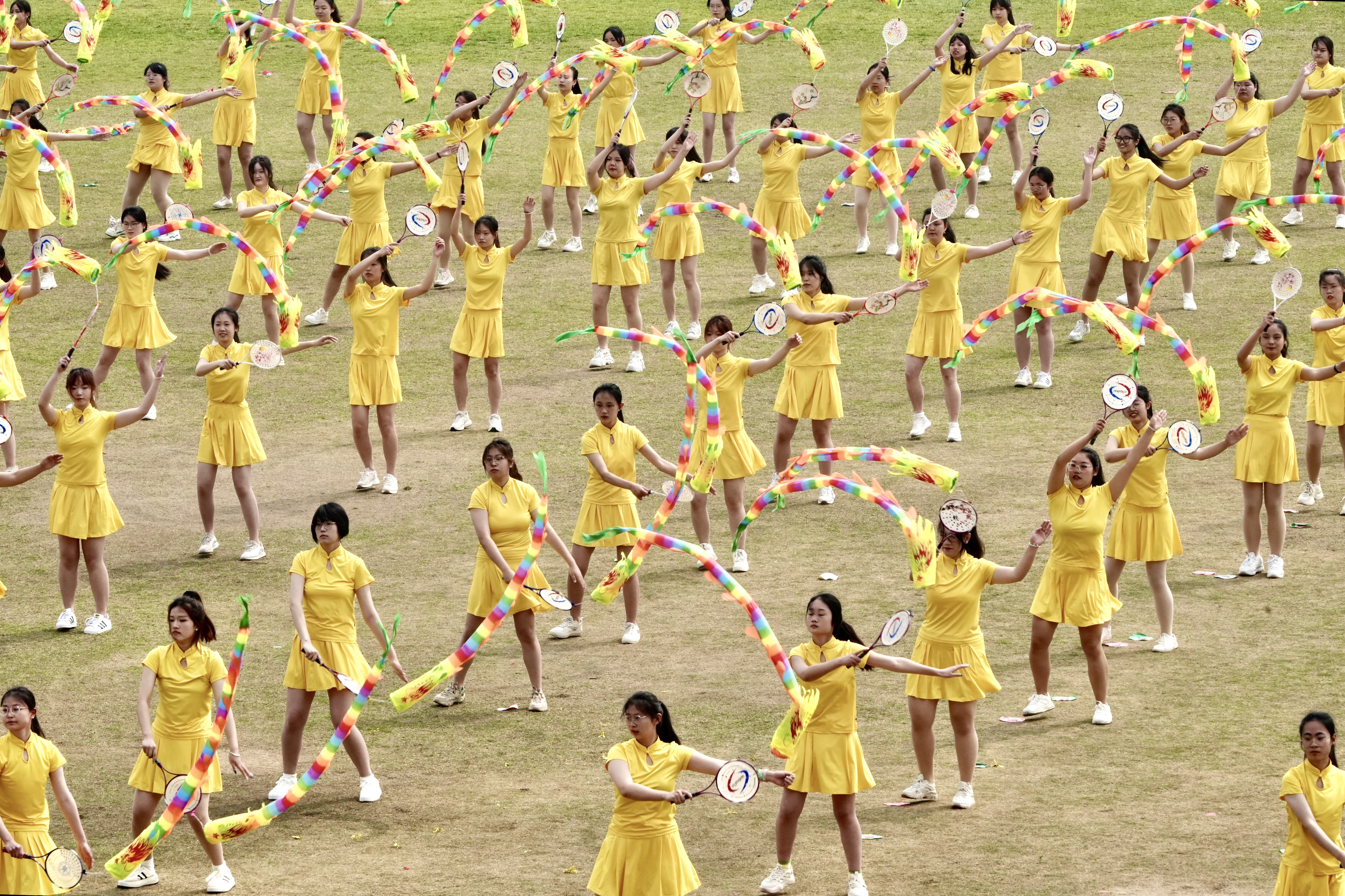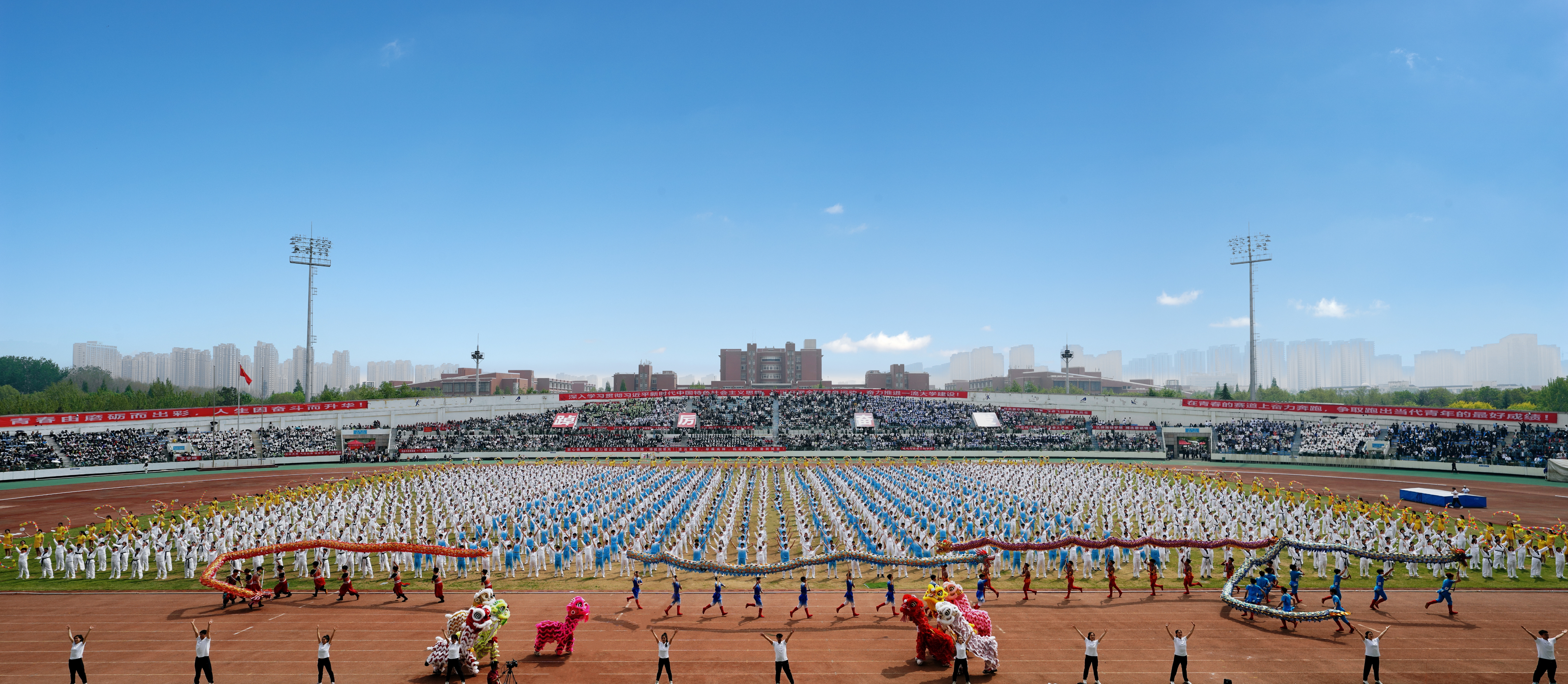 大型开幕式展演拉开帷幕,分为三个部分。第一部分是由河南省航模队带来的航模表演,仿真飞行器、遥控飞人等精彩表演引起全场欢呼。第二部分是展现非遗文化魅力的龙狮共舞表演,表演者不断变换队形和动作,彩龙飞舞,雄狮翻腾。第三部分是大型团体操表演《同在阳光下》,包含四个篇章。第一篇章“龙武传承”,400余名风华正茂的郑大学子以棍为笔、以场为纸,书写青春华章,传扬武术之魂。第二篇章“坚韧不拔”,450余名学生带来跆拳道表演,一拳一掌、一招一式,尽展百折不挠的意志品质。第三篇章“凝心聚力”,由2022级学生带来绵中有刚、刚中带柔的柔力球表演,自然流畅的配合展现强大的凝聚力和向心力。第四篇章“灼灼芳华”,来自50多个基层单位的800余名女教职工带来《春之律动》表演,彰显自信自强的巾帼力量和奋进一流的巾帼担当。最后,所有表演成员带领全场观众舞动双手,激扬的歌声和欢呼声响成一片,将开幕式推向高潮。