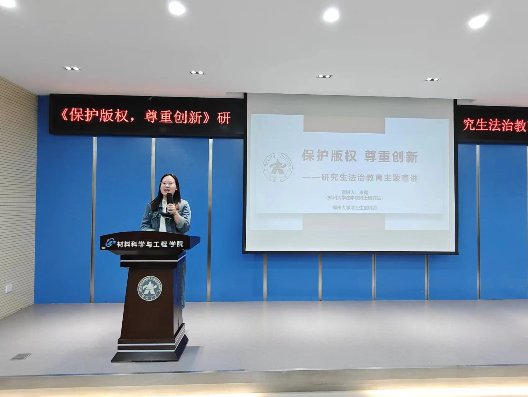 党委宣传部、校团委举办“畅游之路,有法相助”主题观影活动、“学法知法守法 成长成人成才”法治知识竞赛和“知宪法于心,守法律于行”法治教育外展,丰富法治宣传教育形式。学生处组织各学院开展法治专项主题班会、年级会、法治宣讲等活动,全面深入开展法治宣传教育。研究生院、党委研究生工作部邀请法学院李普老师做客第四十四期“学术与人生”讲座,与百余名师生开展“就业平等与劳动权益保障”主题分享;组织博士生宣讲团成员法学院博士生米竞走进材料科学与工程学院,以“保护版权 尊重创新”为主题进行宣讲。教务部、大学生就业创业指导服务中心利用招生宣传咨询、就业招聘会设立权益保护与服务平台,开展法治咨询宣讲。
