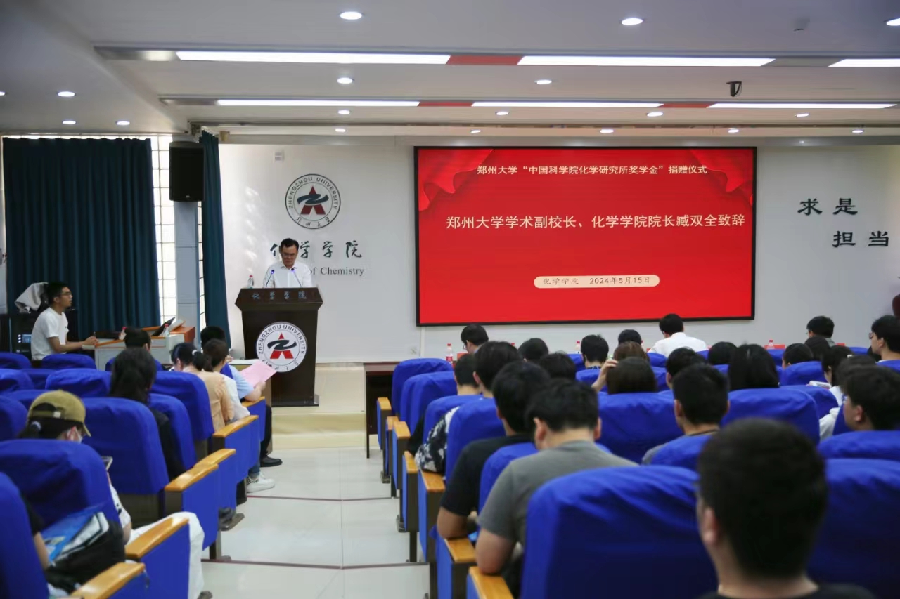 臧双全致辞。他向中国科学院化学研究所的支持表示感谢,并简要介绍了学校和学院的发展情况以及教育发展基金会在助力一流大学建设工作中取得的成效。他表示,学校取得的成绩既离不开几代郑大人的辛勤付出,也得益于社会各界的鼎力支持,中国科学院化学研究所在pp电子官方网站设立奖学金,彰显出高度的社会责任感与使命感,体现出对化学专业人才的重视和期望。双方要进一步发挥各自优势,共同探索高层次创新人才培育新模式与新机制。希望同学们不负众望,勇于创新、敢于突破,将所学知识和才干投入到国家发展建设中。