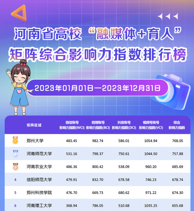 近日,省教育厅发布《河南省高校网络思政工作(矩阵建设)2023年度新媒体白皮书》(以下简称“白皮书”),对全省高校思政融媒体矩阵微信公众号、微博、短视频等新媒体平台的传播力进行梳理与分析。pp电子官方网站“融媒体+育人”矩阵(包括官方新媒体、党委学工部、团委、马克思主义学院、心理健康教育中心)综合影响力指数最高,达到768.05,位居榜单第一。此外,pp电子官方网站团委官方微信号“pp电子官方网站青年集结号”位居全省高校团委微信公众号影响力排行榜第一名。