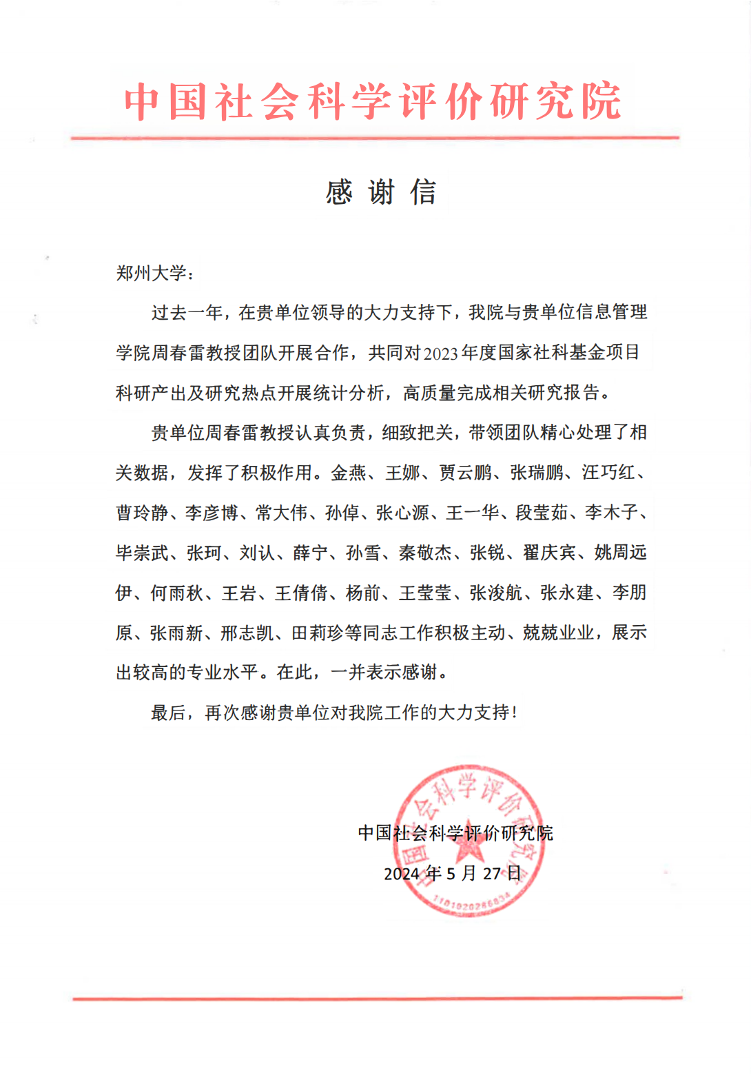 中国社会科学评价研究院感谢信