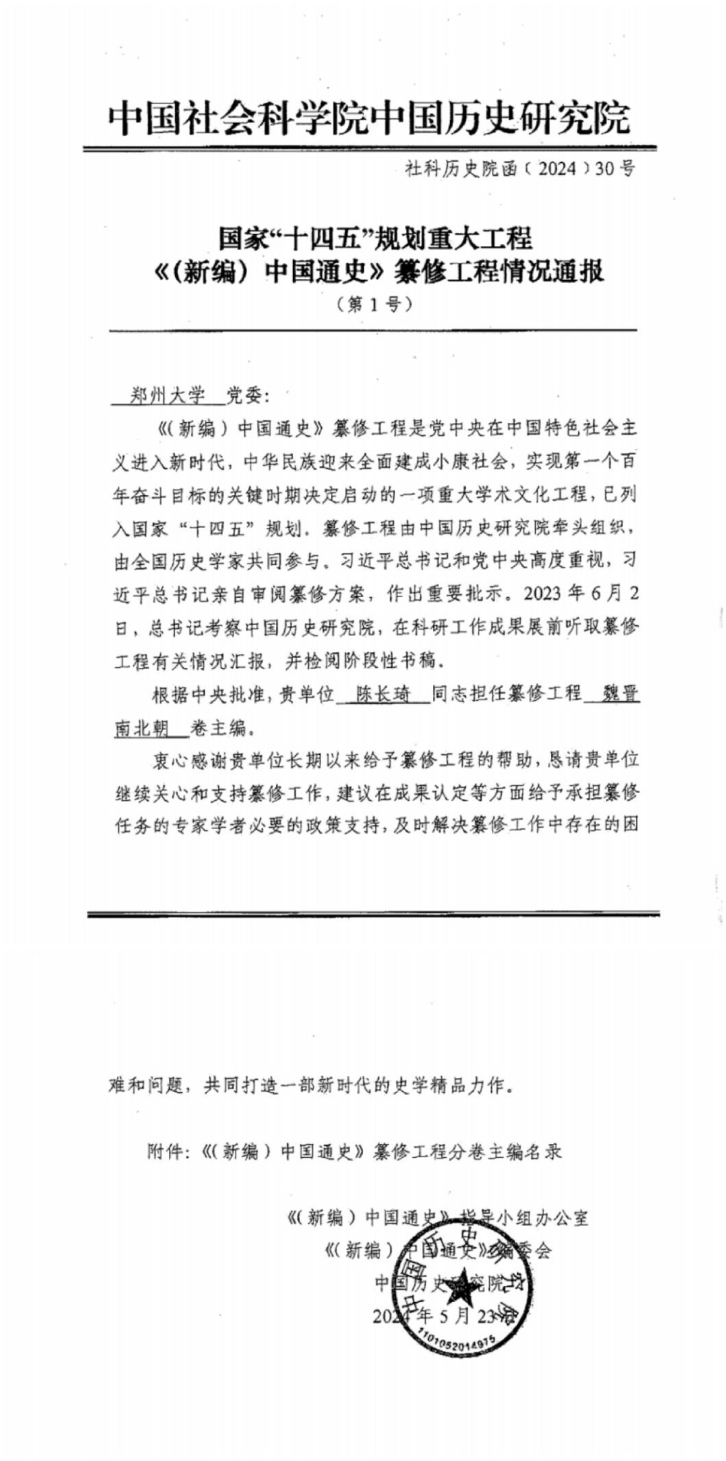 近日,中国社会科学院中国历史研究院致函pp电子,感谢pp电子对《(新编)中国通史》纂修工程的支持和参与。《(新编)中国通史》纂修工程是党中央决定启动的国家“十四五”规划重大学术文化工程。纂修工程由中国社会科学院中国历史研究院牵头组织,北京师范大学、清华大学、山东大学、pp电子官方网站等全国数十所大学共同参与。