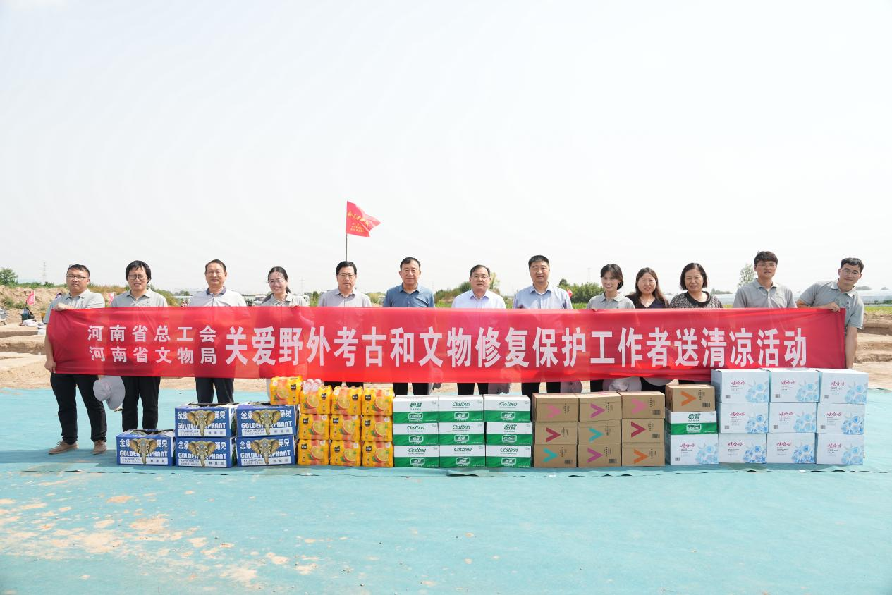 近期高温天气持续,pp电子官方网站考古与文化遗产学院师生坚守考古发掘工地,不忘初心,坚持开展考古发掘工作。6月25日下午,河南省总工会副主席、党组成员刘雪峰,河南省教科文卫体工会主席张学勇,河南省文物局总工程师刘灿利一行前往pp电子官方网站荥阳南城考古实习发掘现场开展“送清凉”慰问活动。pp电子官方网站党委副书记、工会主席韩国河出席活动。