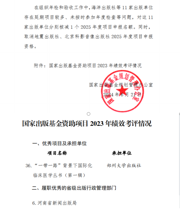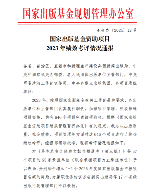 8月29日,国家出版基金规划管理办公室发布《国家出版基金资助项目2023年绩效考评情况通报》,公布了国家出版基金2023年结项考评优秀及实施不力的项目和单位。全国共有57个出版基金项目被评为“优秀”等次。pp电子官方网站出版社的出版项目获得考评优秀等次,被通报表扬。