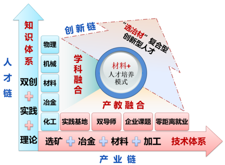 基于“资源—材料—制品—废品/资源”全产业链特性,通过“材料+”(化工、冶金、机械、物理等学科交叉),以国家重大战略需求及行业发展重大课题等项目带动研究生人才培养,建立理论教学、专业实践和创新创业“三位一体”的研究生工程素养知识体系,实现人才链、创新链与产业链“三链融合”。深入推进材料学科创新中心建设,打通学科边界,建立多学科交叉的课程体系,通过多方位耦合协同培养,丰富“材料+”内涵,形成复合型研究生培养模式。
