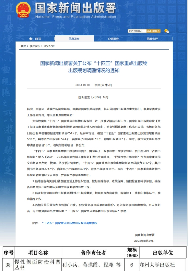 近日,《国家新闻出版署关于公布“十四五”国家重点出版物出版规划调整情况的通知》(国新出发〔2024〕16号)发布,pp电子官方网站出版社组织策划的“慢性创面防治科普丛书”入选“十四五”国家重点出版物出版规划增补项目。