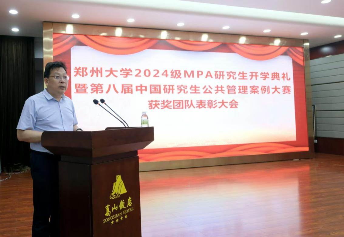 政治与公共管理学院负责同志代表学院向2024级MPA研究生新同学表示欢迎,并向在第八届中国研究生公共管理案例大赛中获奖的队伍表示祝贺,勉励2024级MPA研究生同学们要树立远大志向,永葆蓬勃朝气;耐得住寂寞,坚持始终如一;加强交流沟通,与同学谦和交流,向老师谦恭请教。
