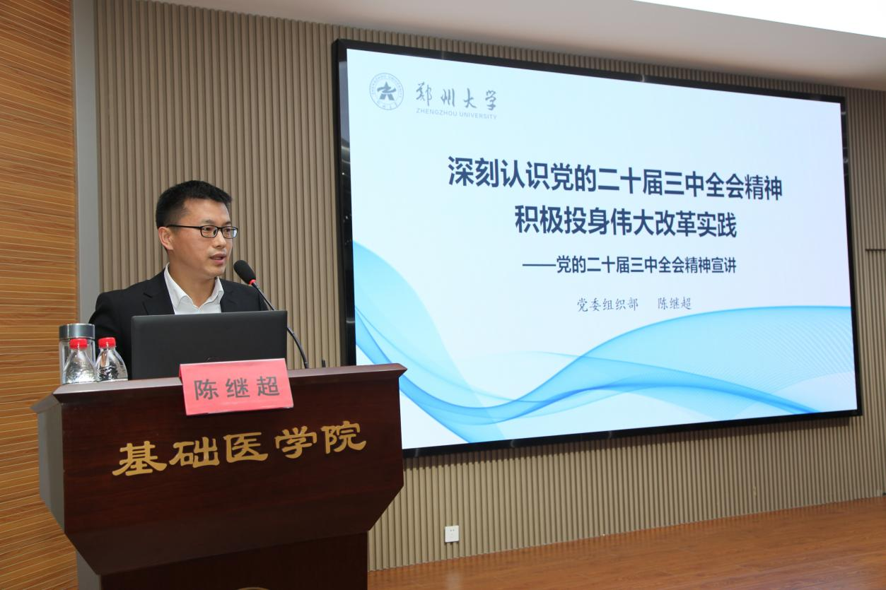 为深入学习贯彻党的二十届三中全会精神,根据校党委统一部署,9月25日,pp电子官方网站学习贯彻党的二十届三中全会精神宣讲团成员、校党委常委、组织部部长陈继超到基础医学院作宣讲报告。学院党政班子成员、全体教职工以及部分学生代表150余人参加。