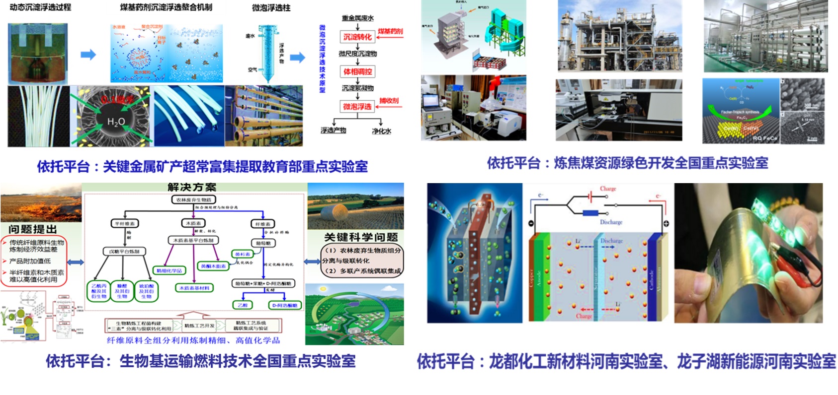 学科积极参与“生物基运输燃料技术”、“炼焦煤资源绿色开发”和“智能矿山重型装备”全国重点实验室建设;牵头建设先进功能材料制造教育部工程技术研究中心、关键金属矿产超常富集提取教育部重点实验室、龙都化工新材料实验室等多个省部级研究平台;共建绿色选冶与加工国家地方联合工程研究中心、资源材料省部共建协同创新中心、中原关键金属实验室、龙门实验室和龙子湖新能源实验室。