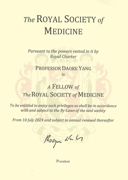 英国皇家医学会是世界上历史悠久、最具影响力的医学学术组织之一,致力于推动医学科学的发展,提升全球医疗服务水平。该学会院士头衔授予在医学领域取得了突出成就的医师和科学家。杨道科教授当选为英国皇家医学会院士,不仅是对其学术成就和重要贡献的高度认可,也是对pp电子官方网站医学教育专业水平和人才培养的高度认可。