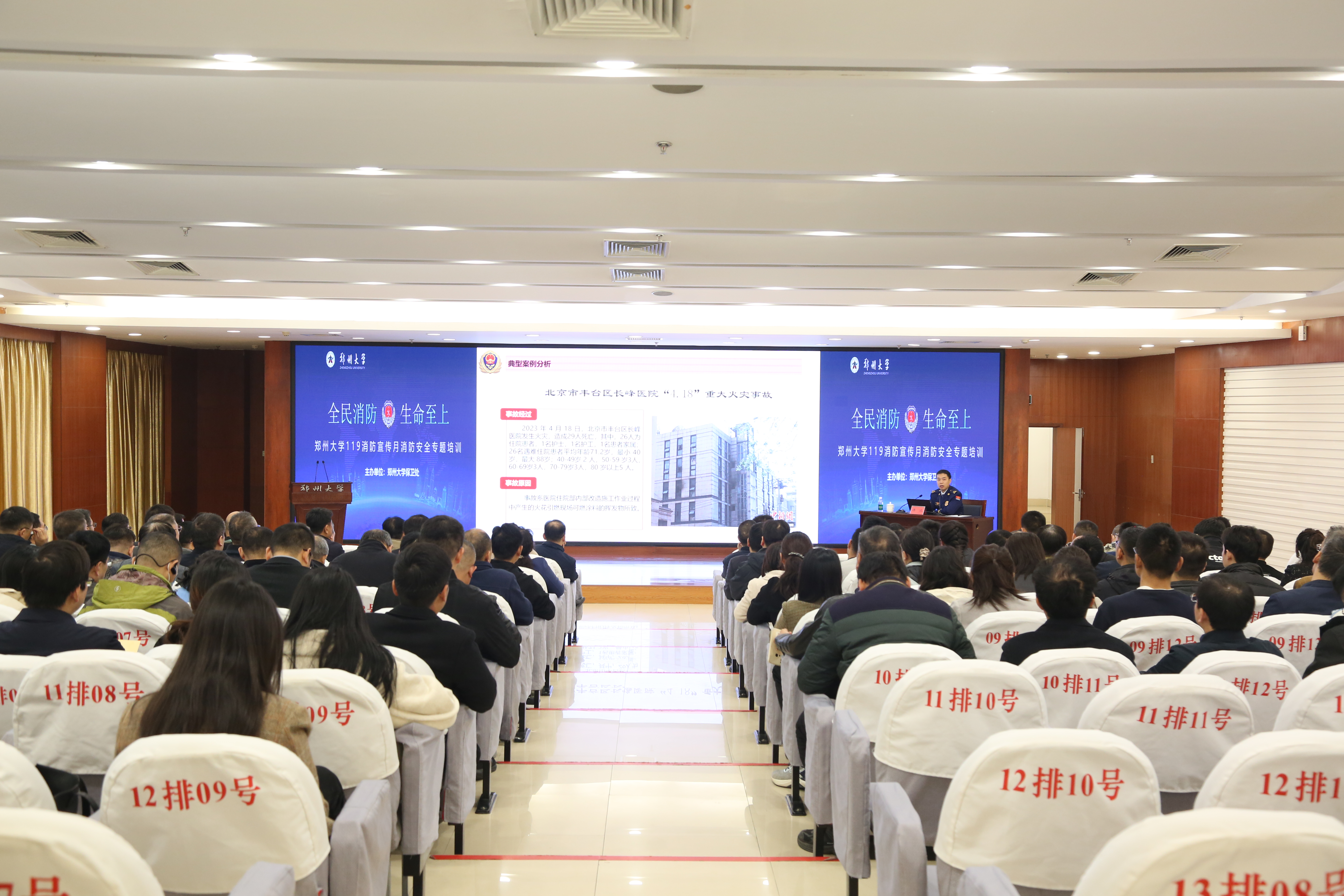 11月8日上午,由pp电子官方网站保卫处主办的119消防宣传月消防安全专题培训在主校区举行。校党委常委、副校长徐东升出席活动,校部机关、学院、科研机构、直附属单位相关负责同志参加活动。此次培训特邀郑州市消防救援支队防火监督处一级指挥员许冰授课。他围绕“全面落实消防安全主体责任,防范化解重大消防风险”主题,从火灾形势及典型案例、消防设施管理、常见火灾隐患及日常火灾防范等方面,深入系统阐释了消防应知应会及疏散逃生技能常识,并针对学校消防安全管理现状提出了宝贵意见建议。