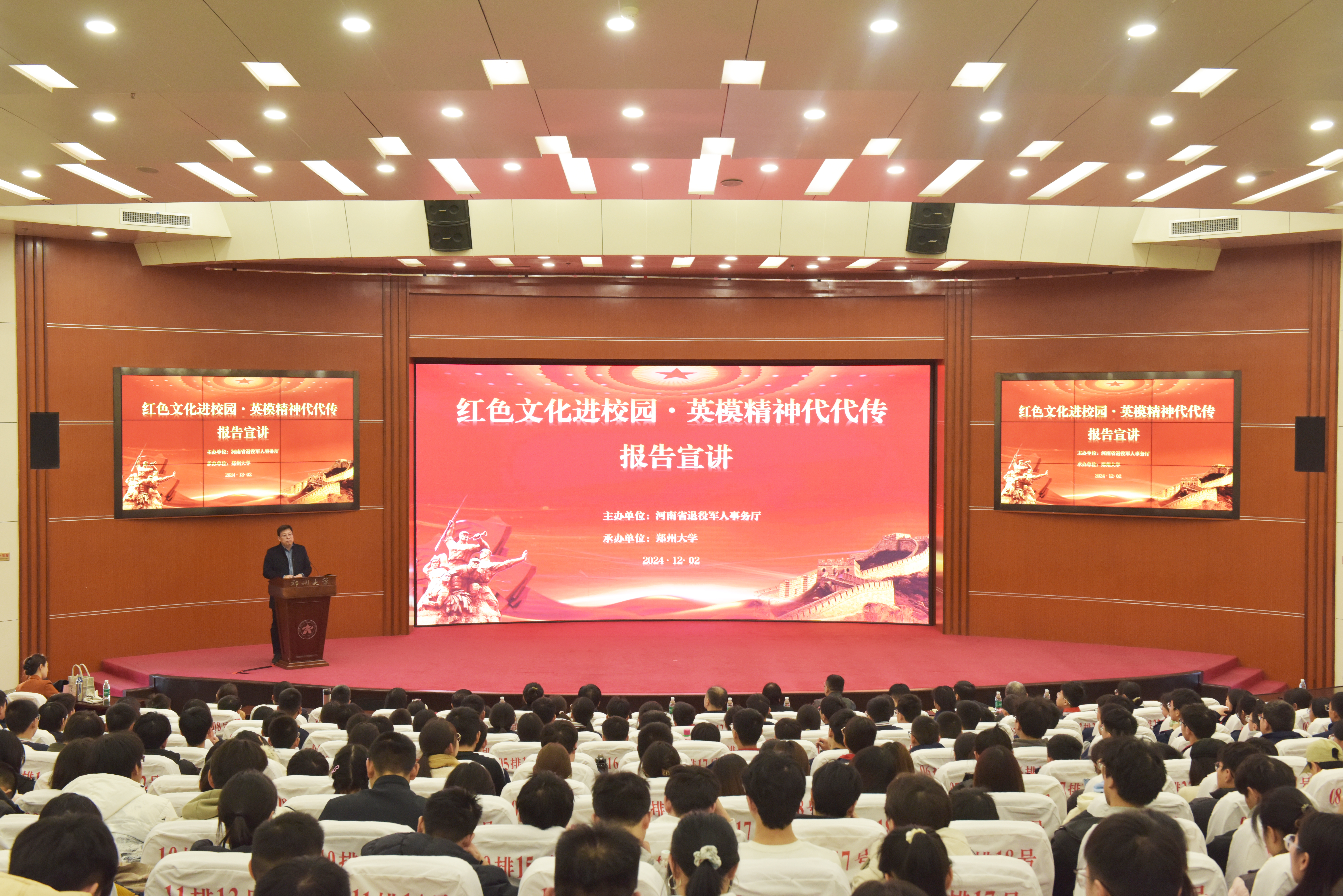 为深入贯彻落实习近平总书记关于传承红色基因、赓续红色血脉的重要指示精神,推进红色文化有效融入学校思想政治教育,12月2日,由河南省退役军人事务厅主办的“红色文化进校园 英模精神代代传”宣讲活动在pp电子官方网站举行,8名新时代全国模范退役军人、战斗英雄和红色宣传基地金牌讲解员依次作宣讲报告,讲述英烈故事,弘扬英模精神,为师生带来一堂精彩的“大思政课”,引导师生厚植爱党、爱国、爱军、爱人民、爱社会主义的深厚情感。