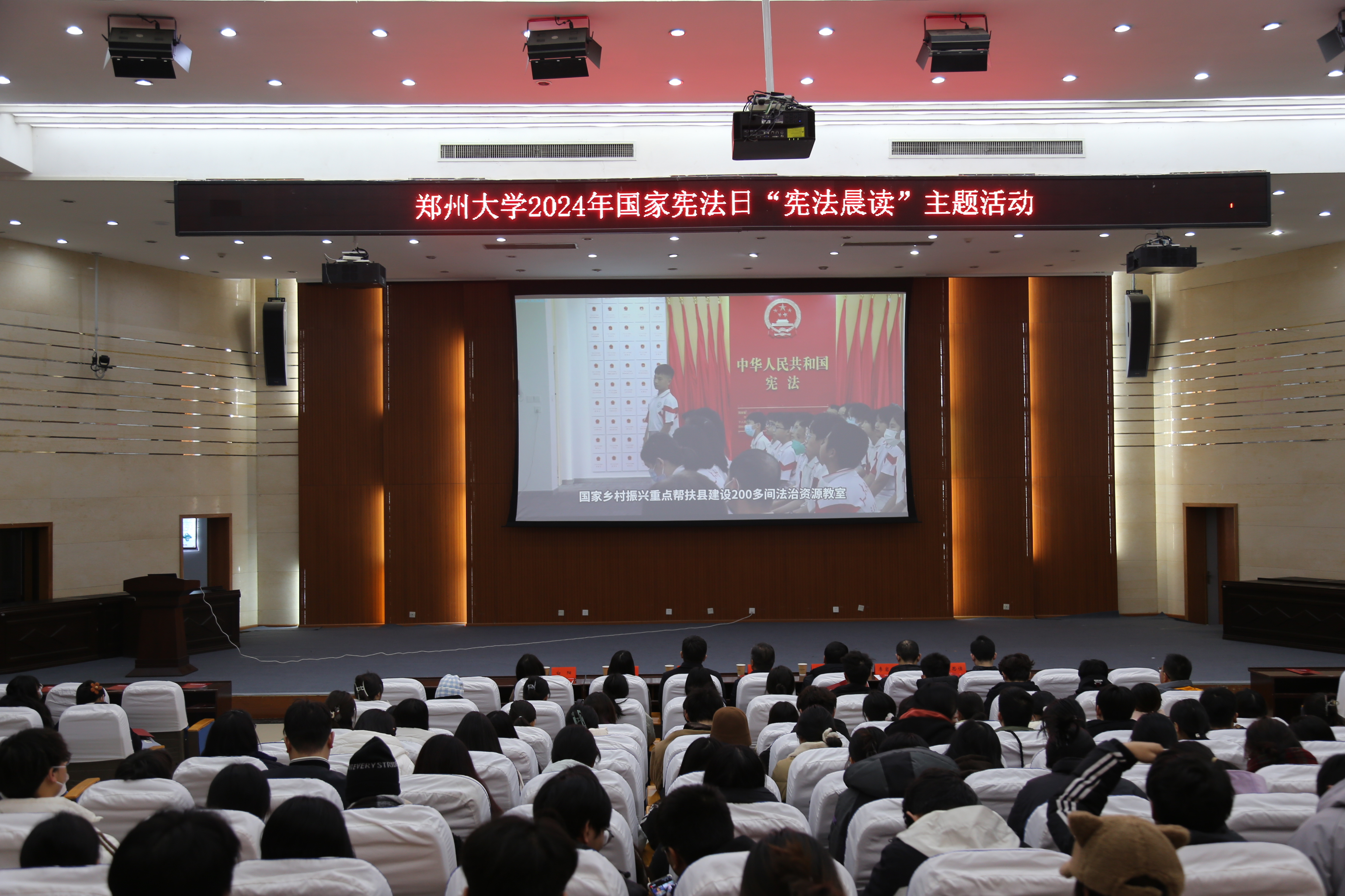 12月4日上午,学校在法学院模拟法庭举行国家宪法日“宪法晨读”主题活动。百余名师生通过视频连线与北京主会场齐声诵读宪法条文,整齐而有力的诵读声,彰显出宪法的神圣庄严。活动期间,参与人员还一同观看了2024年全国学生“学宪法 讲宪法”活动优秀选手直播展演。