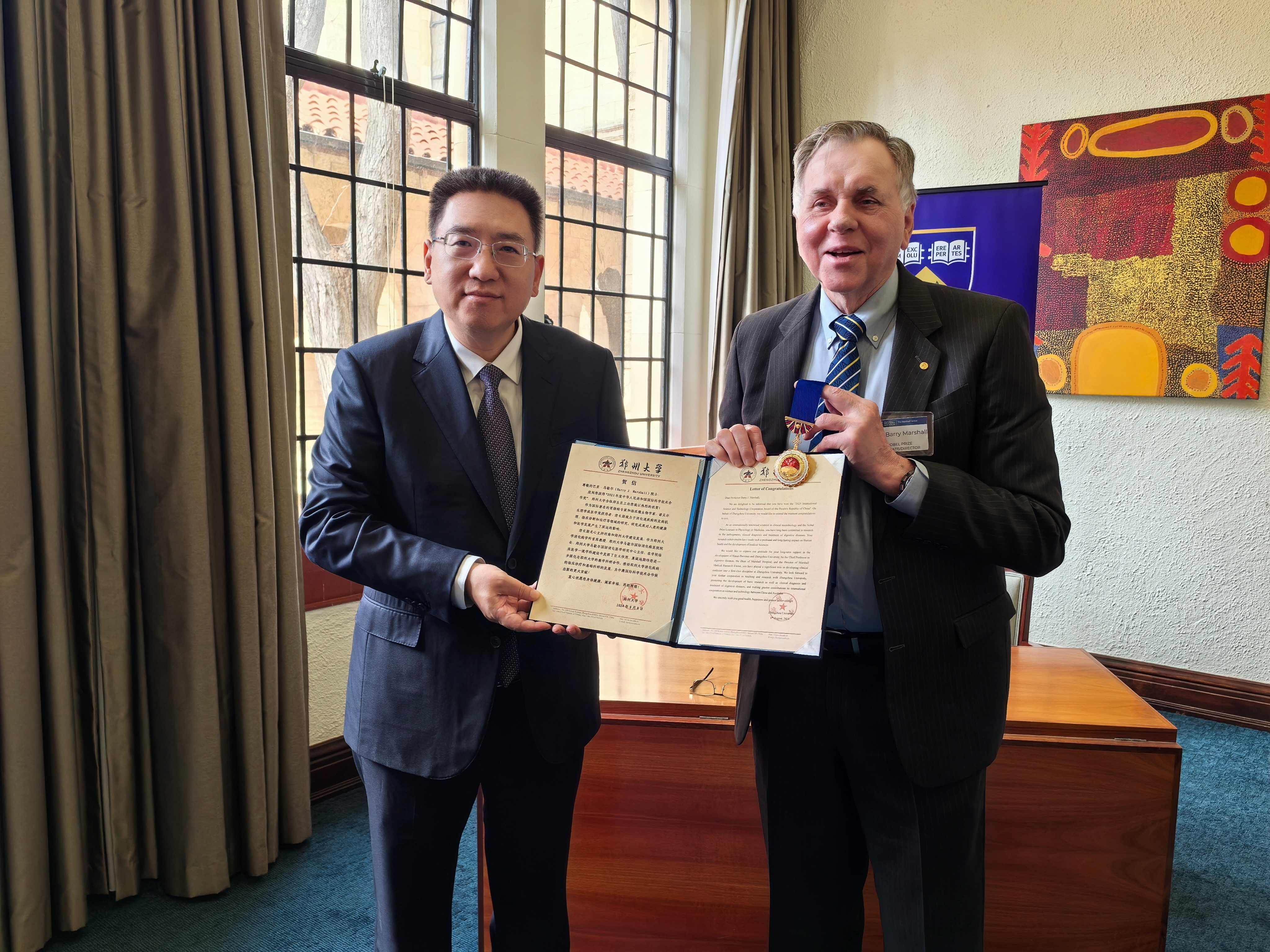 8月13日上午,别荣海一行访问澳大利亚西澳大学。诺贝尔奖获得者、中国工程院外籍院士、西澳大学生物医学科学学院巴里·马歇尔教授,西澳大学校长阿米特·查克玛(Amit Chakma),河南省委常委、组织部部长、教工委书记王刚,河南省委外事办公室主任梁杰一,河南省教育厅副厅长吕冰,中国驻珀斯总领事龙定斌等出席座谈会。别荣海代表学校向马歇尔院士荣获中国国际科技合作奖致贺信,并与阿米特·查克玛签署合作备忘录和海外学习项目协议书。在珀斯期间,还与科廷大学土木与机械工程学院卢春生教授、中国驻珀斯总领馆同志和校友代表开展座谈交流。