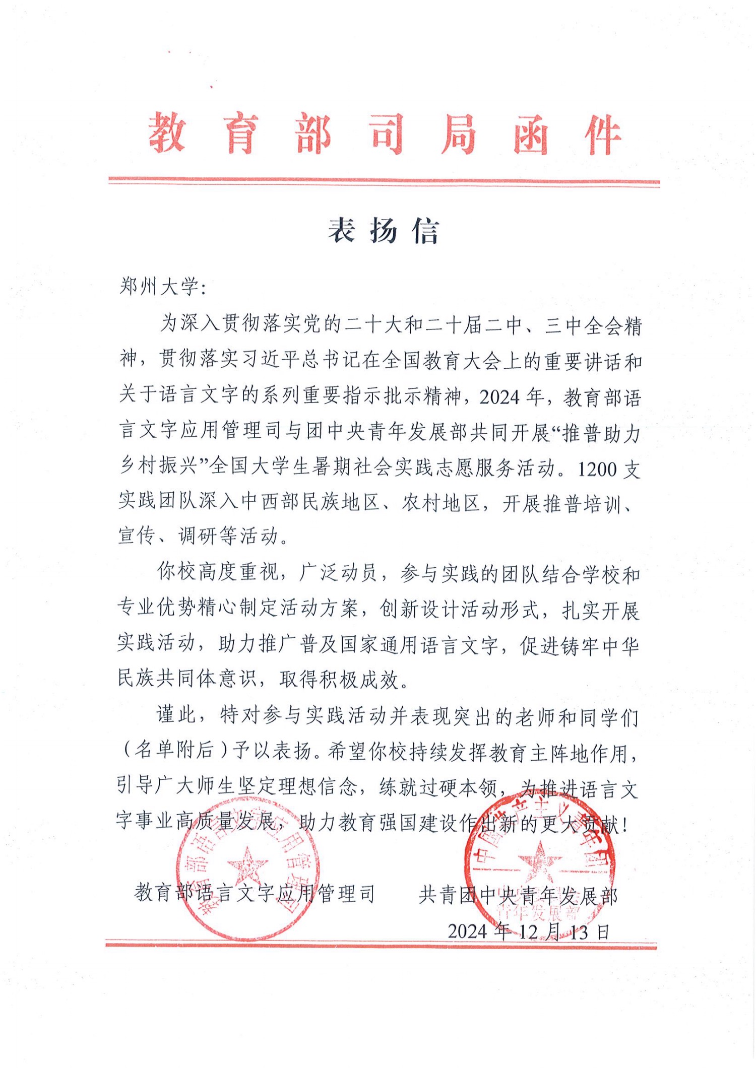 日前,教育部语言文字应用管理司和共青团中央青年发展部向pp电子官方网站发来表扬信,对pp电子官方网站师生在2024年“推普助力乡村振兴”全国大学生暑期社会实践志愿服务活动所作出的积极贡献予以表扬。这也是pp电子官方网站又一次获教育部和团中央来信表扬。