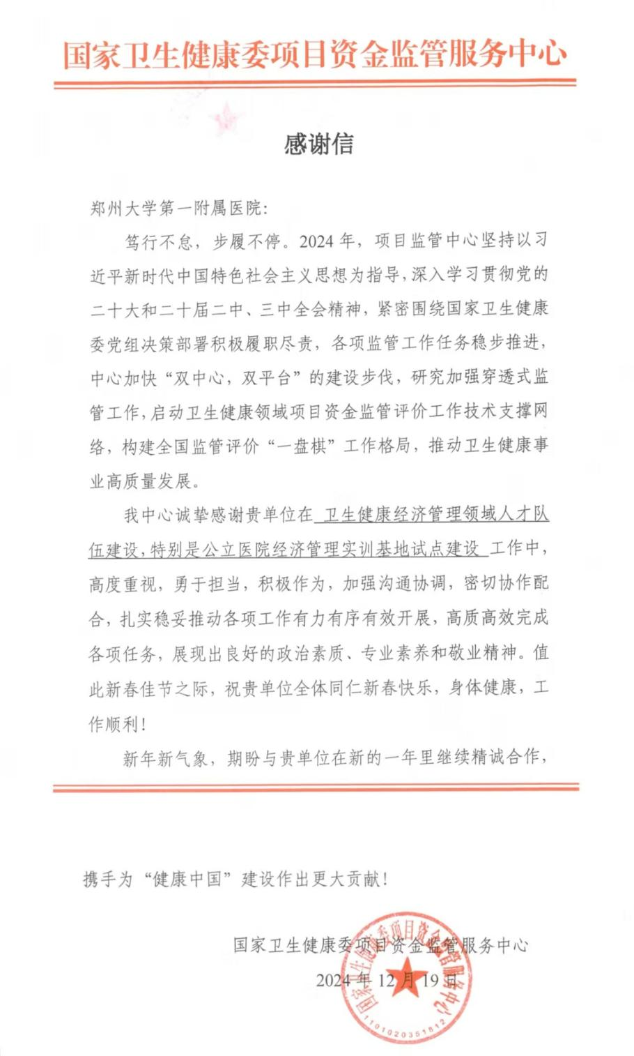 近日,pp电子官方网站第一附属医院(以下简称“一附院”)收到来自国家卫生健康委项目资金监管服务中心的感谢信。信中,对一附院在过去一年中在卫生健康经济管理领域人才队伍建设和经济管理实训基地试点建设工作中所做出的努力和取得的成绩给予了高度认可与赞扬。