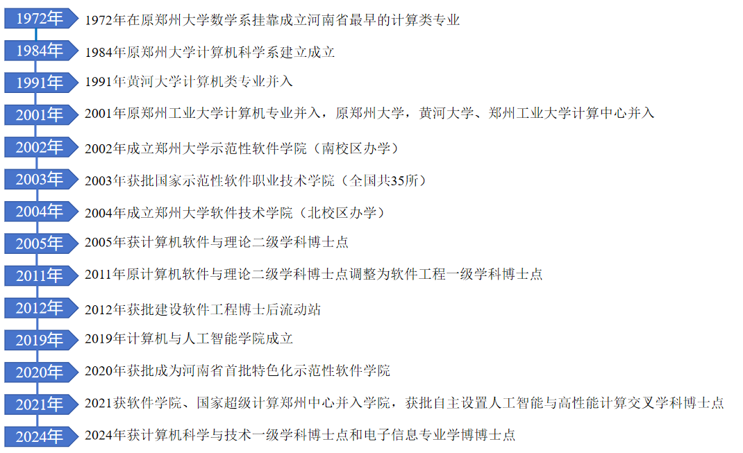 pp电子官方网站计算机科学学科专业历史悠久,始于1956年原pp电子官方网站数学系及1985年原郑州工业大学电机系计算机及应用专业,由北京大学、吉林大学、山东大学等高校优秀师资援建。1972年,原pp电子官方网站正式成立计算技术专业,为河南省最早计算机类专业,后更名为计算机科学。1984年,计算机科学专业独立成系。此后,相继并入原黄河大学计算机相关学科、原pp电子官方网站计算中心、原郑州工业大学计算机及自动化系计算机专业,并成立pp电子官方网站示范性软件学院(南校区)及软件技术学院(北校区)。2005年获计算机软件与理论二级学科博士点,2011年调整为软件工程一级学科博士点,2012年获批软件工程博士后流动站。2020年,学院成为河南省首批特色化示范性软件学院,2021年获河南省唯一的人工智能与高性能计算交叉学科博士点,2024年获计算机科学与技术一级学科博士点和电子信息专业博士点,实现了河南省属高校在这两个领域博士学位点零的突破。