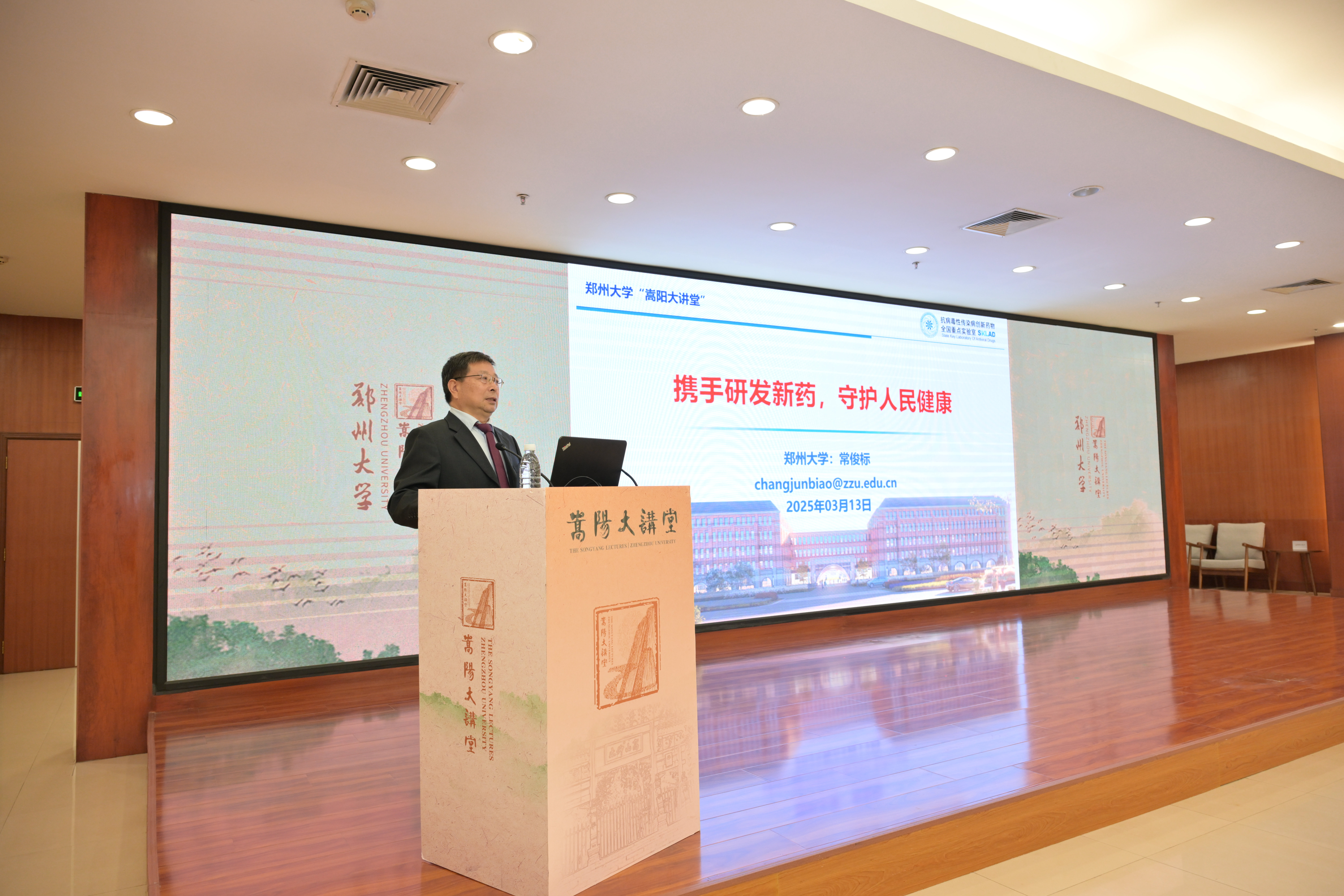 创新药研发有什么重要意义?常俊标以《携手研发新药,守护人民健康》为题,从战略意义、亟需突破的关键技术以及精准药物设计的核心方向三个维度向大家分享了他的科研感悟:“在创新药的星辰大海,为患者打造生命之光。”他以发现青蒿素等为例,讲述了我国在新药研发领域取得的成绩及面临的挑战,指出“自己的问题,要自己想办法解决”,必须要有“从0到1的突破”,才能让创新药“贴上‘中国药’标签”,在重大疾病领域实现“从跟跑到领跑”的跨越。他还回顾了自己留学归国、传承师恩的成长经历,以及带领团队研发出我国首个抗新冠病毒小分子口服药“阿兹夫定”的故事,激励广大师生提升解决“卡脖子”问题的原始创新能力,践行“守护人民生命健康”初心使命,积极服务“健康中国”战略。