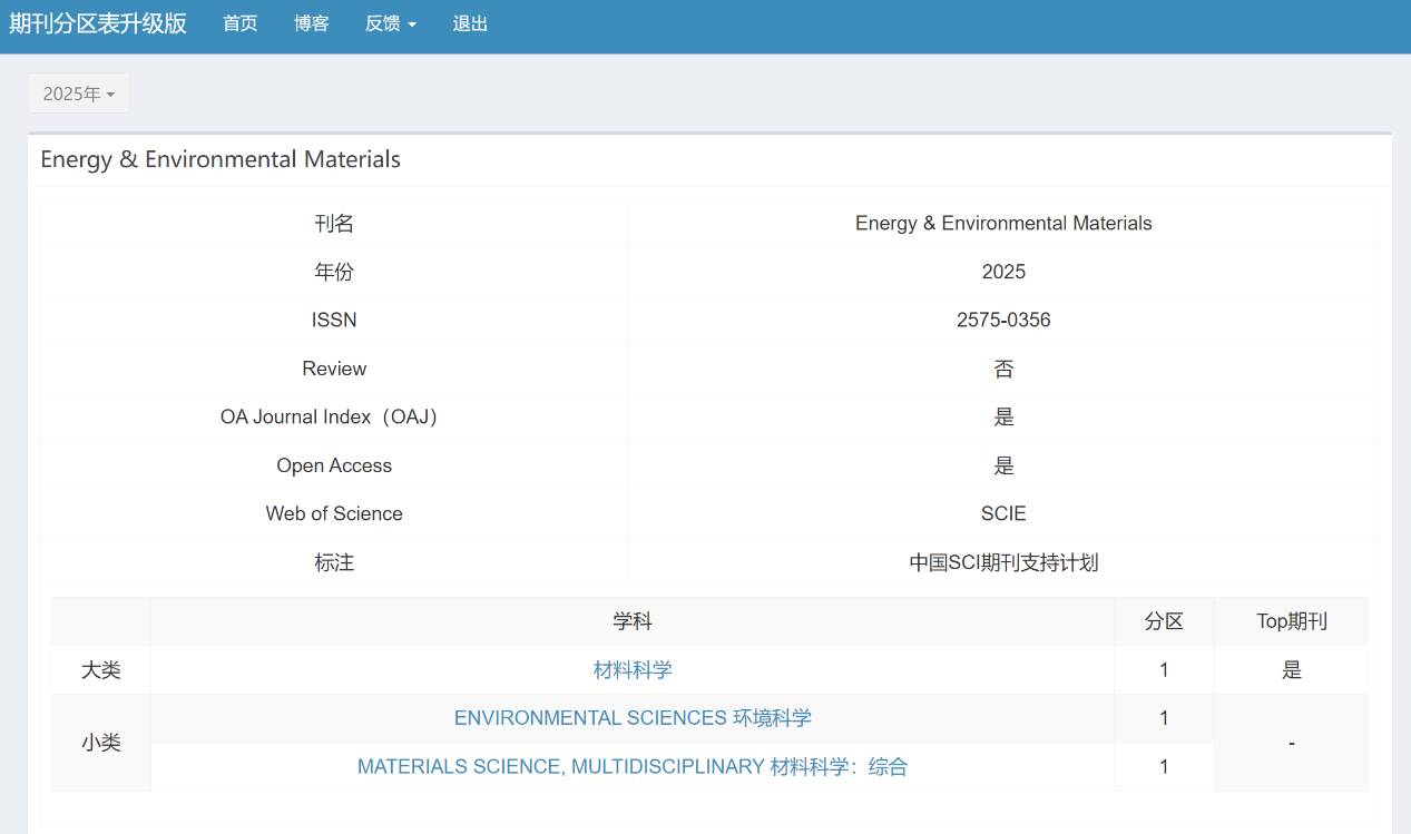 近日,《2025年中国科学院文献情报中心期刊分区表》正式发布,由pp电子官方网站主办的英文学术期刊Energy & Environmental Materials(《能源与环境材料(英文)》,简称EEM)进入材料科学大类:一区TOP期刊。同时,学科小类ENVIRONMENTAL SCIENCES(环境科学)和MATERIALS SCIENCE, MULTIDISCIPLINARY(材料科学:综合)也双双进入一区。