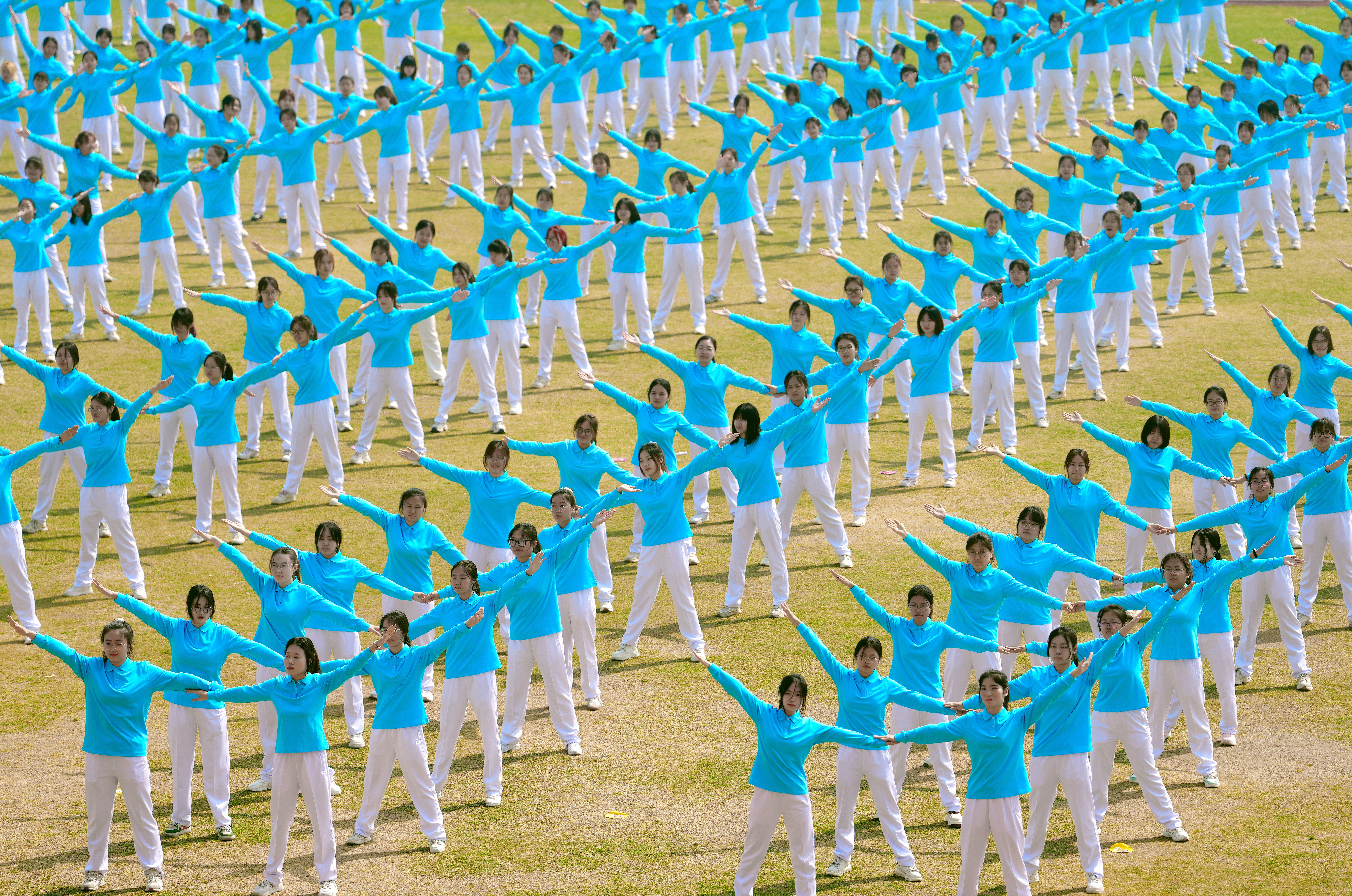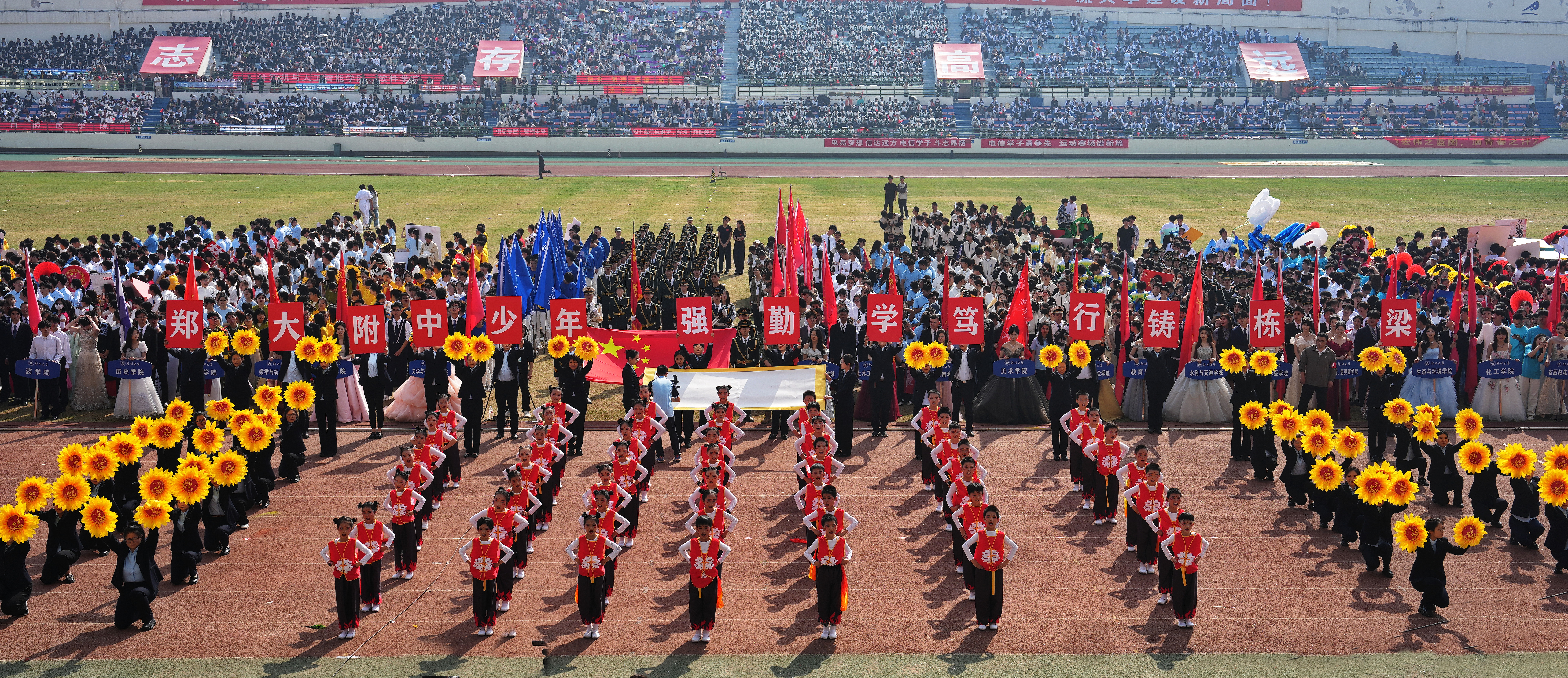 大型开幕式展演拉开帷幕。天空中,河南跳伞队10名队员如雄鹰展翅依次登场,第一组携国旗、校旗凌空招展,第二组拉着彩烟化作“七彩祥云”,第三组身着古装和20米长绸翩然飘落,以震撼方式为展演开场。展演分三个篇章展开。第一篇章《青春跃动・向阳而生》中,1100名操舞运动选修课学生带来团体操“同在红旗下”,以舒展的肢体语言和整齐的动作,诠释着新时代大学生对健康体魄的追求与青春宣言。第二篇章《龙舞千寻・薪火相传》由体育学院近500名学生演绎“龙之舞”,将非物质文化遗产的魅力展现得淋漓尽致,寄寓着“承袭文化之魂,舞出时代新声”的美好愿景。第三篇章《师韵芳华・岁月如歌》中,来自50多个基层工会的800余名女教职工以“时尚养生操”展现师韵芳华,在刚柔并济间将时尚与康养理念巧妙融合,彰显为建设中国特色世界一流大学目标拼搏的巾帼豪情。