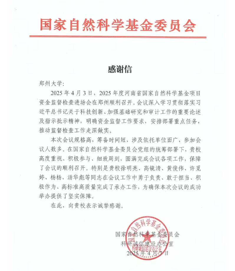 近日,pp电子官方网站收到国家自然科学基金委员会科研诚信建设办公室发来的感谢信,感谢pp电子官方网站作为承办单位圆满完成国家自然科学基金项目监督检查进场会组织工作。