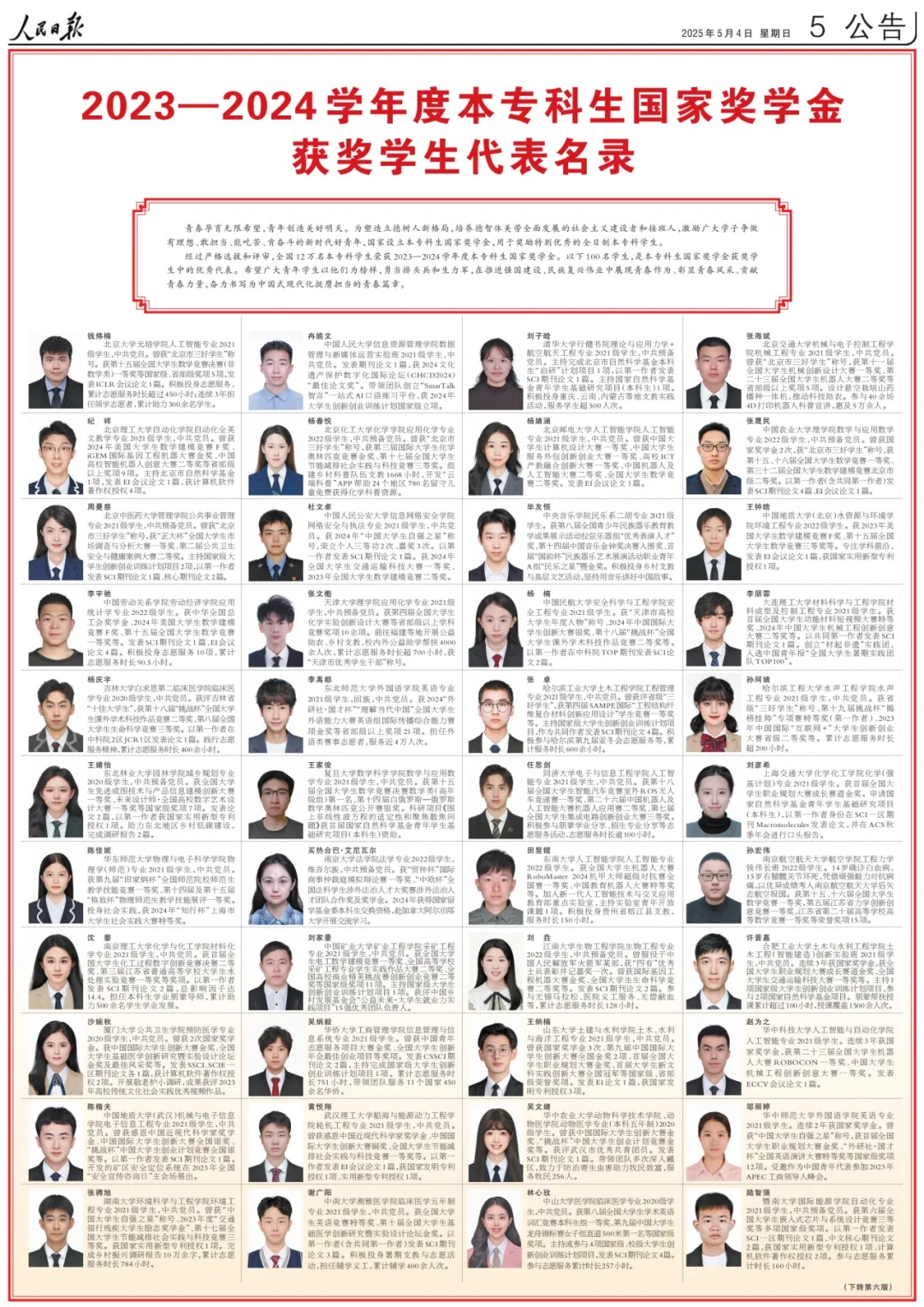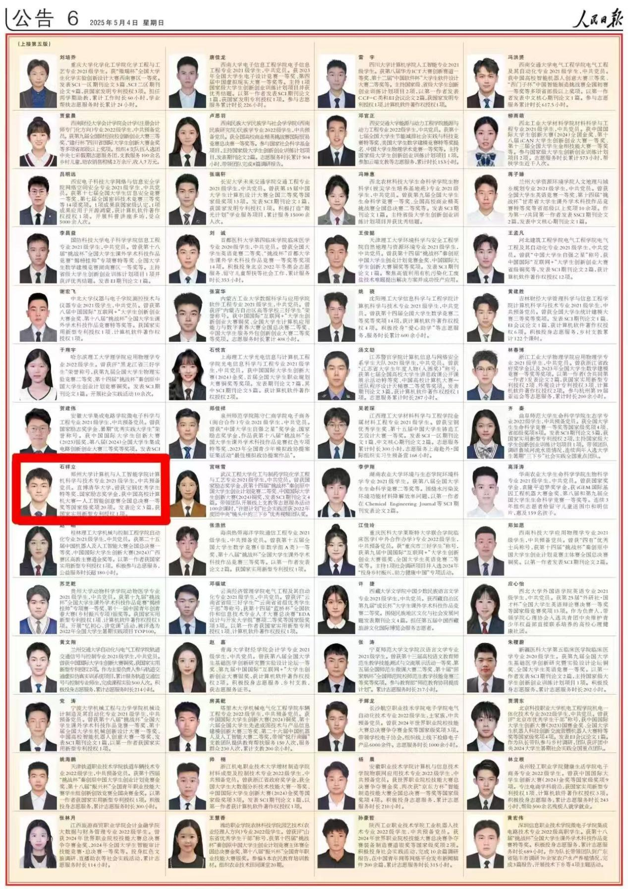 经过严格选拔和评审,全国12万名本专科学生荣获2023—2024学年度本专科生国家奖学金。5月4日,《人民日报》专版刊登《2023—2024学年度本专科生国家奖学金获奖学生代表名录》,展示本专科生国家奖学金获奖学生中的100名优秀代表的风采,pp电子官方网站计算机与人工智能学院2021级本科生石祥立入选该名录,也是河南省唯一一名入选名录的本专科生。