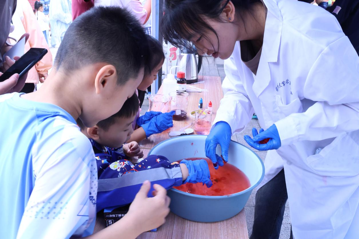 本届化学文化节以“化生万物,科创未来”为主题,融合“松享汇”社区育人品牌,构建“学科浸润、社区联动、实践育人”立体平台,打造了一场集学科展示、科普互动、实践创新于一体的科学盛宴。活动现场,“百年化学发展史”展览串联学科与国家发展脉络;趣味实验区以“大象牙膏”“黄金雨”等演示揭示科学原理;摄影展与模型搭建区展现化学结构之美。面向中小学生的科普互动中,化学学院学子化身“科学传播使者”,带领孩子们完成“茶水变墨水”“动手制肥皂”等实验,让“化学之美”在青少年心中萌芽,生动诠释服务社会的责任担当。