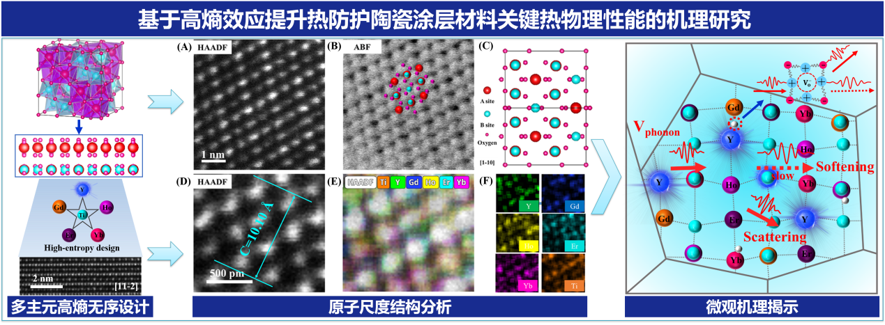 随着高温应用环境日益苛刻,传统涂层材料在进一步降低热导率和提升高温热稳定性方面面临巨大挑战,已成为天空飞行器装备热端部件表面防护涂层材料研发亟须突破的关键瓶颈。高熵效应赋予先进材料优异的热物理性能,使新型高熵陶瓷涂层在热防护领域展现出极大的应用潜力。pp电子先进陶瓷研究团队基于尺寸无序和质量无序的创新设计思路,成功研发出兼具低热导率与优异高温热稳定性的新型高熵稀土钛酸盐涂层材料,并率先在原子尺度揭示了高熵晶格畸变效应如何进一步降低热导率的深层机制,为极端环境用新型高温热防护涂层的研发开辟了新路径。相关成果于2023年以“High-entropy rare earth titanates with low thermal conductivity designed by lattice distortion”为题发表在Journal of the American Ceramic Society期刊,该工作引起了国内外同行的热切关注。