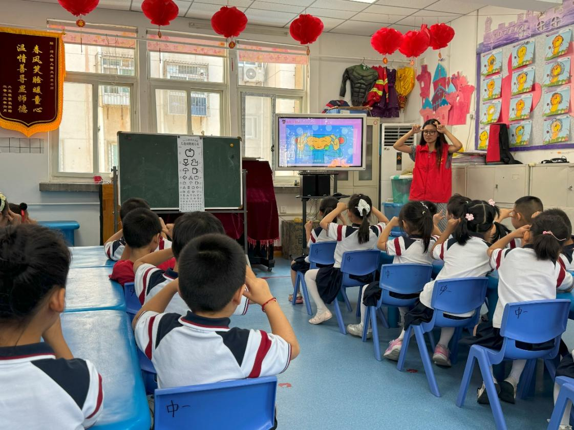 “小朋友们,跟着老师一起做——揉揉小鼻梁,按按小眼眶。”第三临床医学院“童心健康守护团”精心设计了一套符合幼儿认知特点的护眼课程,让孩子们学中玩、玩中学,用专业服务守护儿童用眼健康。