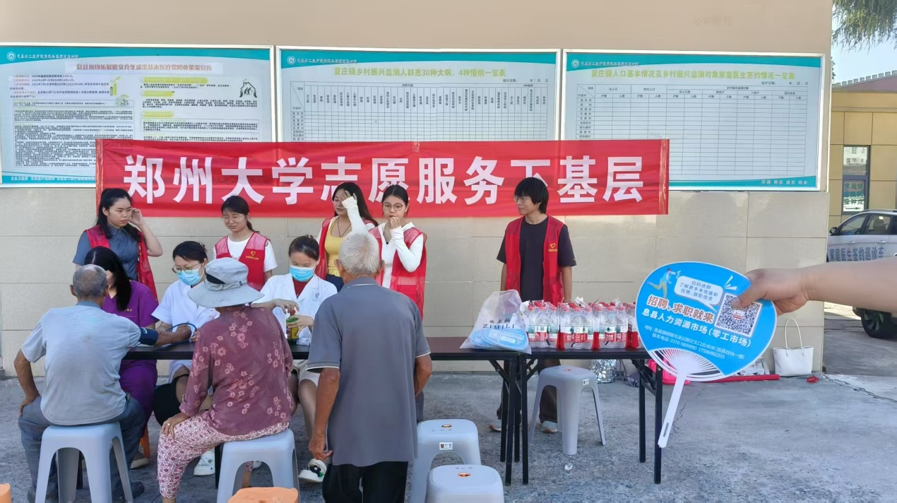 “郑青春,息健康”医心护航实践队队员协助卫生院医护人员测量血压血糖