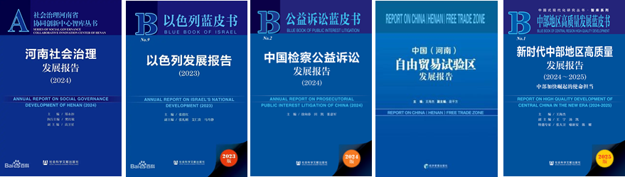以色列蓝皮书《以色列发展报告(2023)》连续发布9年,为加强中以双边交流合作作出了重要贡献。社会治理河南省协同创新中心撰写的《河南社会治理发展报告(2024)》已连续发布11部社会治理蓝皮书,对河南省县域社会治理提出了一系列有针对性的对策建议。《新时代中部地区高质量发展报告(2024—2025)》是我国首部反映中部地区高质量发展的蓝皮书,系统论证了中部地区加快崛起的途径。蓝皮书《中国(河南)自由贸易试验区发展报告》,为增强河南开放韧性、提升开放质量提供了重要参考。公益诉讼蓝皮书《中国检察公益诉讼发展报告(2024)》为优化国家治理体系、提升国家治理效能提供了坚实的法律支撑与实践指南(图3)。