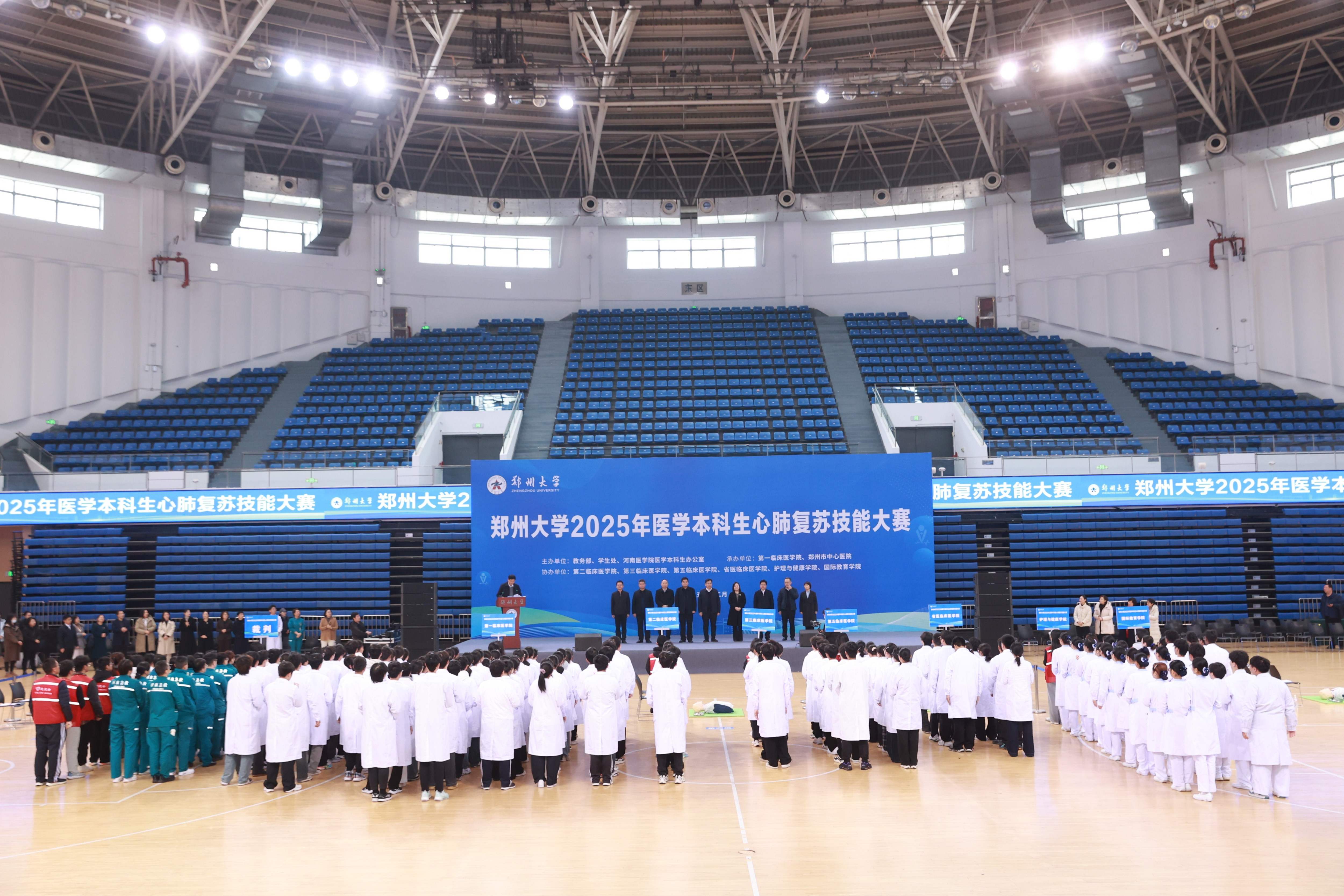 为深入贯彻落实党的二十届四中全会精神,牢固树立健康第一的教育理念,培养具有仁心仁术的高素质医学人才,普及急救知识和技能,提高校园应急救护能力,12月20日,pp电子官方网站2025年医学本科生心肺复苏技能大赛在主校区举行。校党委副书记王利国出席活动。郑州市中心医院裁判员老师,学校相关职能部门及各学院相关负责同志,各学院师生代表等500余人参加活动。