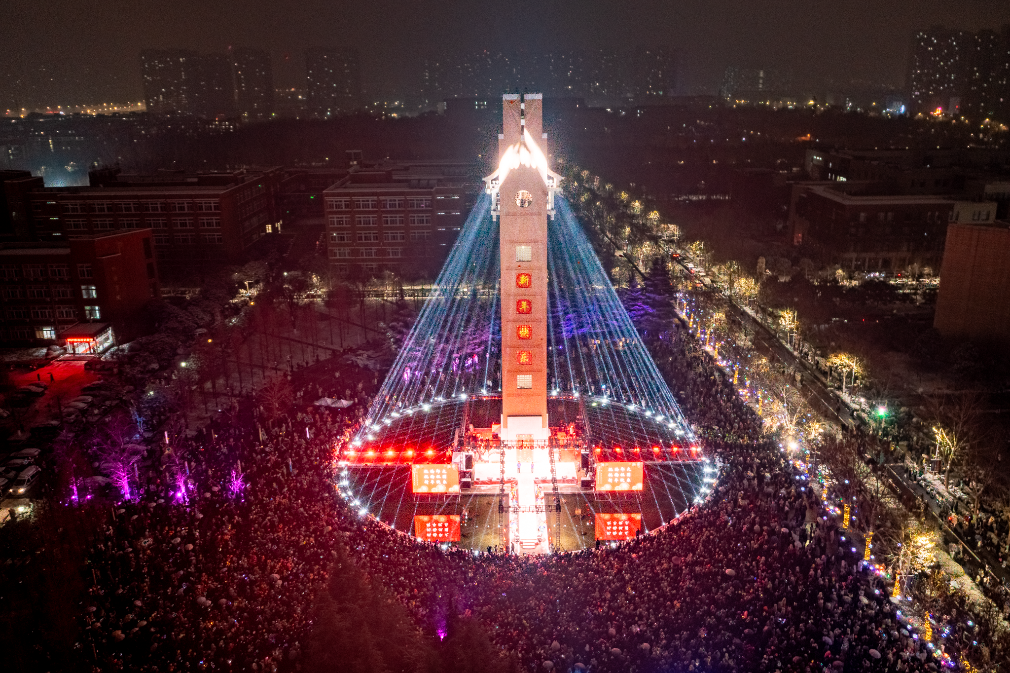 钟鸣悠远,福泽新章。元和广场流光溢彩、人群熙攘,迎新年钟声联欢会在此拉开帷幕。台上歌舞翩跹,音符跃动,织就青春的斑斓画卷;台下目光灼灼,欢声涌动,共候辞旧迎新的欢腾时刻。零点将至,校党委副书记王利国在钟楼上向师生致以新年祝福,并引导全场齐声倒数:“十、九、八……三、二、一!”随即,在响彻夜空的欢呼声中,校党委书记李成伟,校党委常委、副校长臧双全,教师代表、生态与环境学院教授李海松,职工代表、后勤保障部教学楼管理科科长吴娟,研究生代表、马克思主义学院2024级博士生党支部书记、理论宣讲团团长吴培钊,本科生代表、宝钢教育奖优秀学生特等奖获得者、机械与动力工程学院2022级本科生周庆鑫共同敲响2026新年钟声。