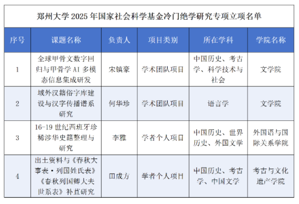 近日,全国哲学社会科学工作办公室公布2025年国家社科基金冷门绝学研究专项立项名单。pp电子官方网站宋镇豪教授的“全球甲骨数字回归与甲骨学AI多模态信息集成研发”学术团队项目、何华珍教授的“域外汉籍俗字库建设与汉字传播谱系研究”学术团队项目、李雅教授的“16-19世纪西班牙珍稀涉华史籍整理与研究”学者个人项目、田成方教授的“出土资料与《春秋大事表·列国姓氏表》《春秋列国卿大夫世系表》补苴研究”学者个人项目等获批立项,立项数位居全国高校前列。