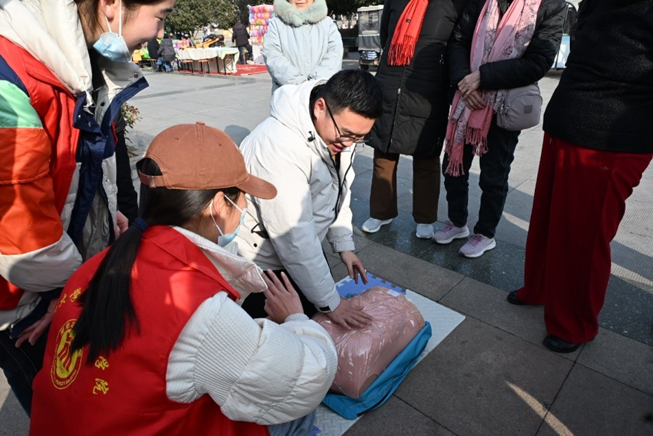 “心手相传”实践队指导群众亲身体验CPR操作,纠正动作细节