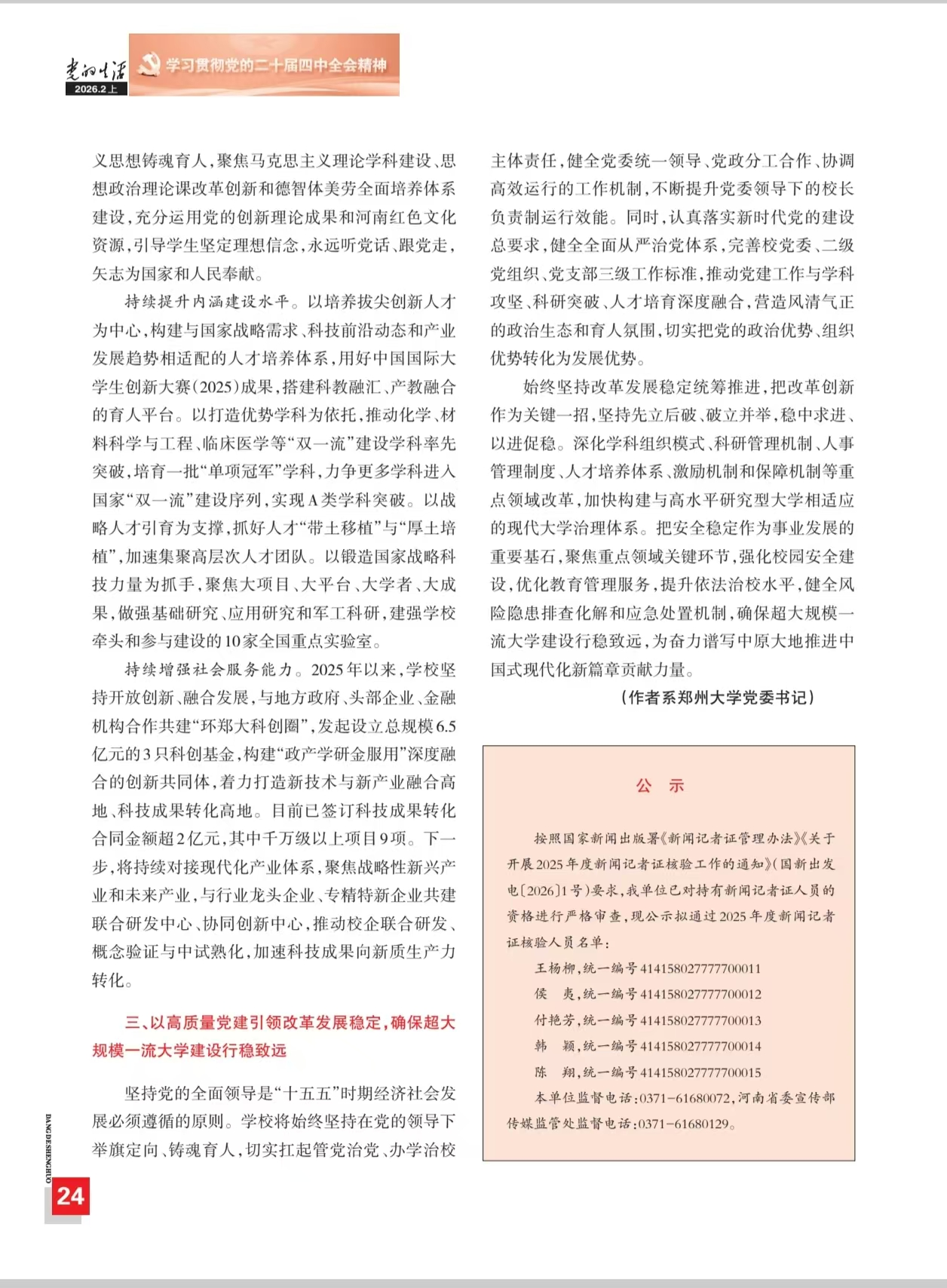 始终坚持改革发展稳定统筹推进,把改革创新作为关键一招,坚持先立后破、破立并举、稳中求进、以进促稳。深化学科组织模式、科研管理机制、人事管理制度、人才培养体系、激励机制和保障机制等重点领域改革,加快构建与高水平研究型大学相适应的现代大学治理体系。把安全稳定作为事业发展的重要基石,聚焦重点领域关键环节,强化校园安全建设,优化教育管理服务,提升依法治校水平,健全风险隐患排查化解和应急处置机制,确保超大规模一流大学建设行稳致远,为奋力谱写中原大地推进中国式现代化新篇章贡献力量。(作者系pp电子官方网站党委书记)