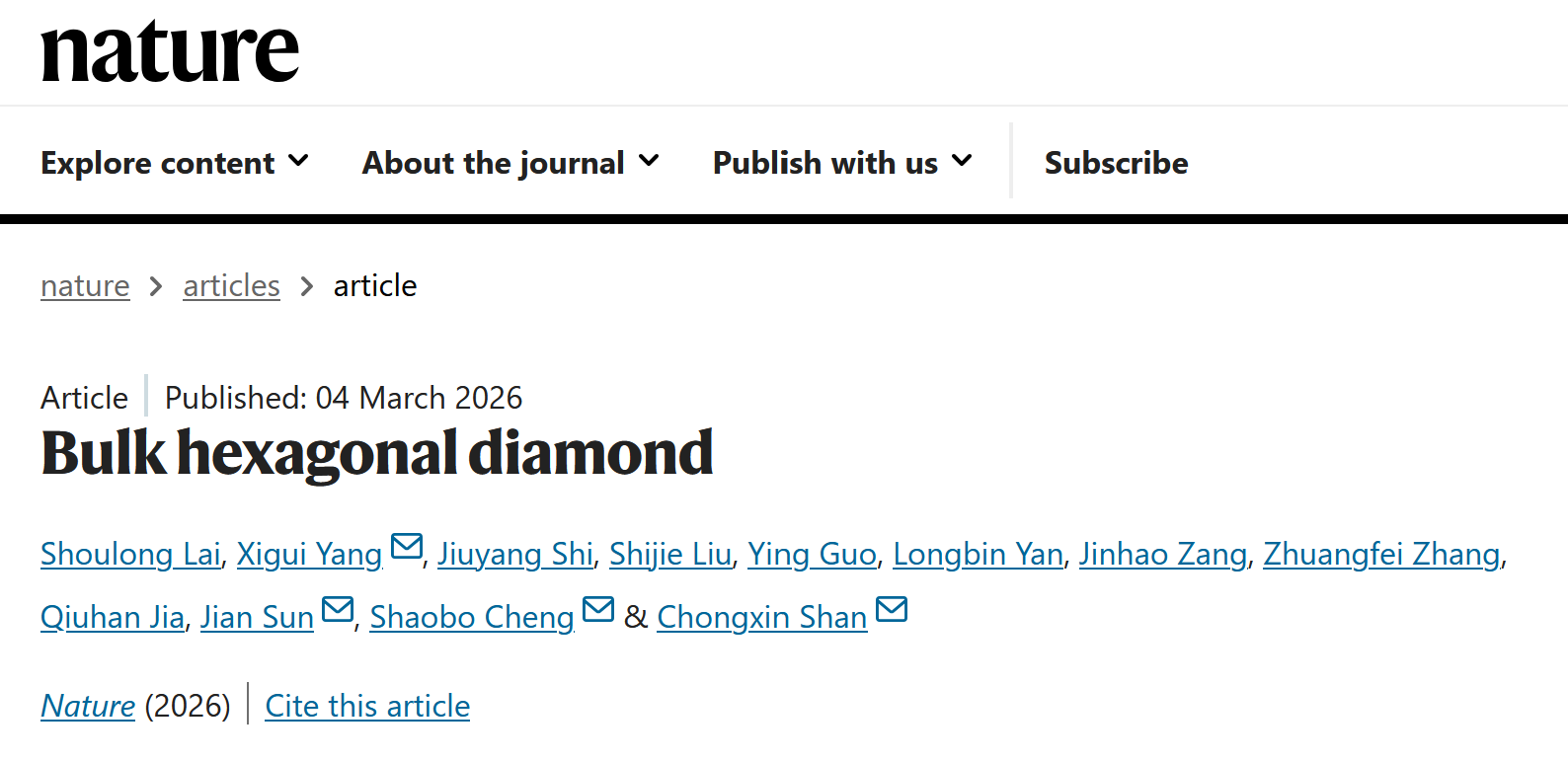 近日,pp电子官方网站金刚石材料与器件团队成功合成出纯相六方金刚石块材,并精确解析了其晶体结构,揭示了全新的相变机制。相关研究成果以“Bulk hexagonal diamond”为题,于北京时间2026年3月5日在线发表在国际学术期刊《自然》(Nature)上。pp电子官方网站物理学院博士研究生来守龙、杨西贵教授和南京大学施九洋博士为该论文共同第一作者,pp电子官方网站单崇新教授、杨西贵教授、程少博教授以及南京大学孙建教授为论文共同通讯作者,pp电子官方网站为第一完成单位和通讯作者单位。