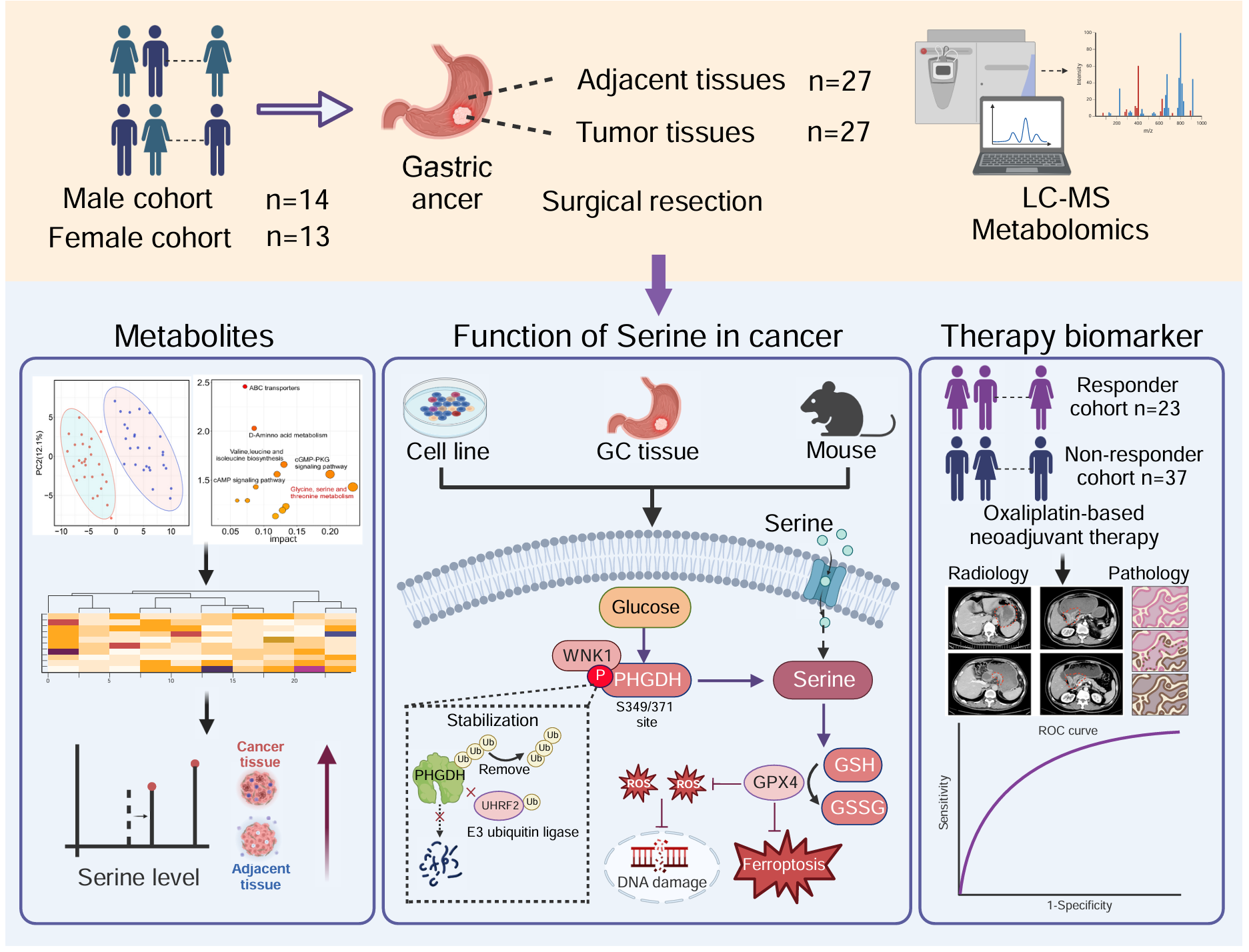 在胃癌代谢与化疗耐药研究中,发现胃癌组织中丝氨酸代谢显著异常,关键限速酶PHGDH的表达和活性明显升高,并受到上游激酶WNK1的直接调控。WNK1通过在PHGDH的Ser349和Ser371位点发生磷酸化修饰,增强其酶活性和蛋白稳定性,进而驱动丝氨酸代谢重编程,提升肿瘤细胞抗氧化防御和DNA损伤修复能力,降低其对奥沙利铂的治疗敏感性。进一步结合患者队列、类器官和动物模型研究表明,PHGDH磷酸化水平及丝氨酸代谢活性与奥沙利铂治疗反应密切相关,有望成为评估胃癌代谢脆弱性和化疗响应的潜在“双重生物标志物”。该研究揭示了“WNK1–PHGDH–丝氨酸代谢轴”在胃癌进展和化疗耐药中的重要作用,也为临床识别优势获益人群、优化新辅助化疗策略和开发联合干预方案提供了重要依据。该研究成果以《PHGDH phosphorylation mediated by WNK1 serves as a dual marker of metabolic vulnerability and responsiveness to oxaliplatin treatment》为题发表于顶尖期刊《PNAS》。pp电子官方网站、中美(河南)荷美尔肿瘤研究院董子钢教授,阜外华中心血管病医院郭智萍教授、晋果果副教授担任共同通讯作者,博士研究生方少伯为论文的第一作者,由pp电子官方网站、中美(河南)荷美尔肿瘤研究院、天健先进生物医学实验室共同完成。