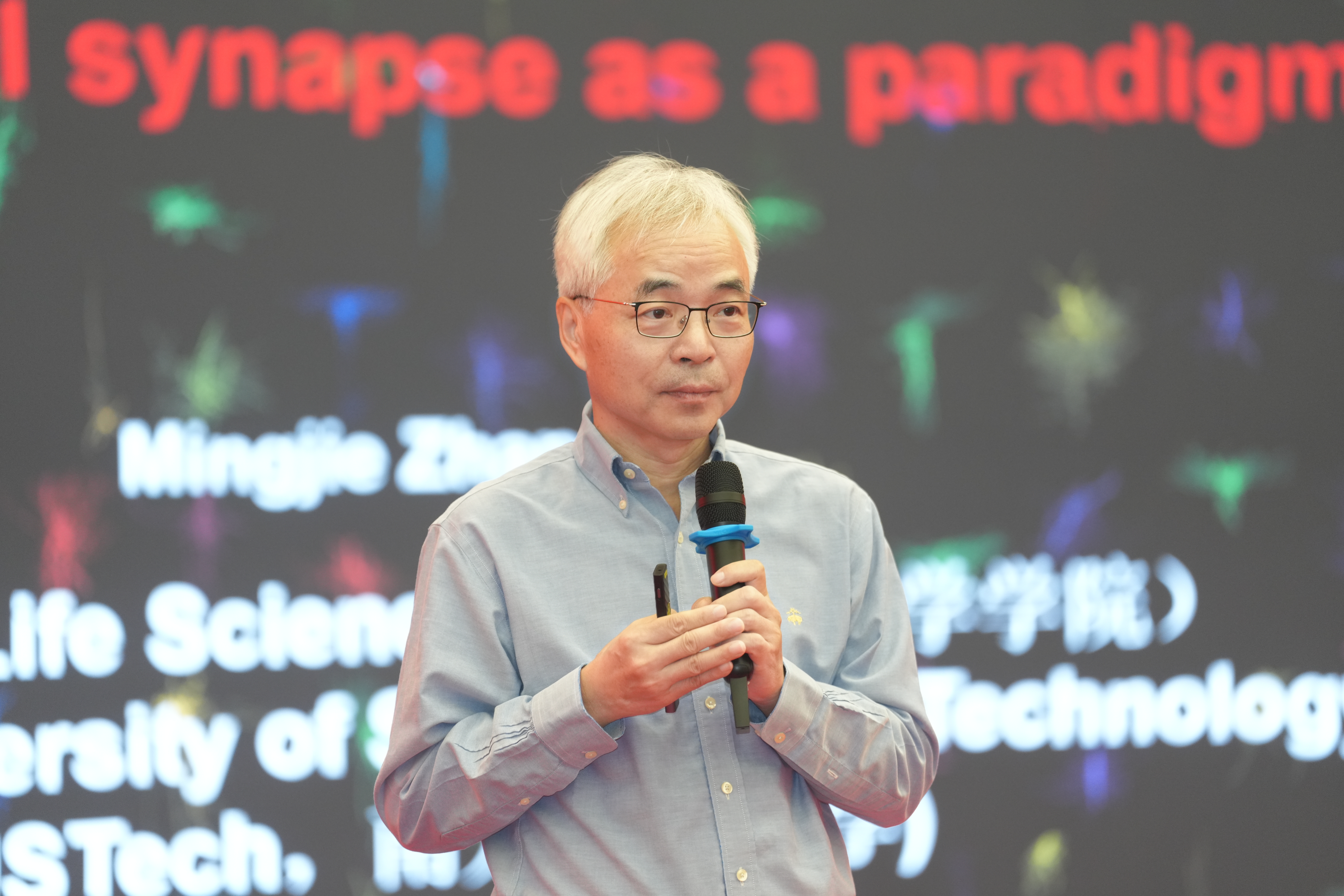 在题为《为什么细胞内的生物大分子需要相分离?》的报告中,张明杰用通俗易懂、条理清晰的语言,为师生带来了一堂兼具专业性与启发性的“生物公开课”。他从神经细胞独特的结构与功能切入,结合30余年神经科学研究经历,层层解析生物大分子相分离问题,还将这一现象比作黑醋倒入橄榄油的液态分离。张明杰分享了团队从发现蛋白作用特殊现象,到揭示相分离机制、验证其在生理过程中作用的科研过程,展现了基础研究的严谨逻辑,同时指出该现象颠覆传统认知,为生命科学研究开辟新视角,推动多学科深度交叉融合。