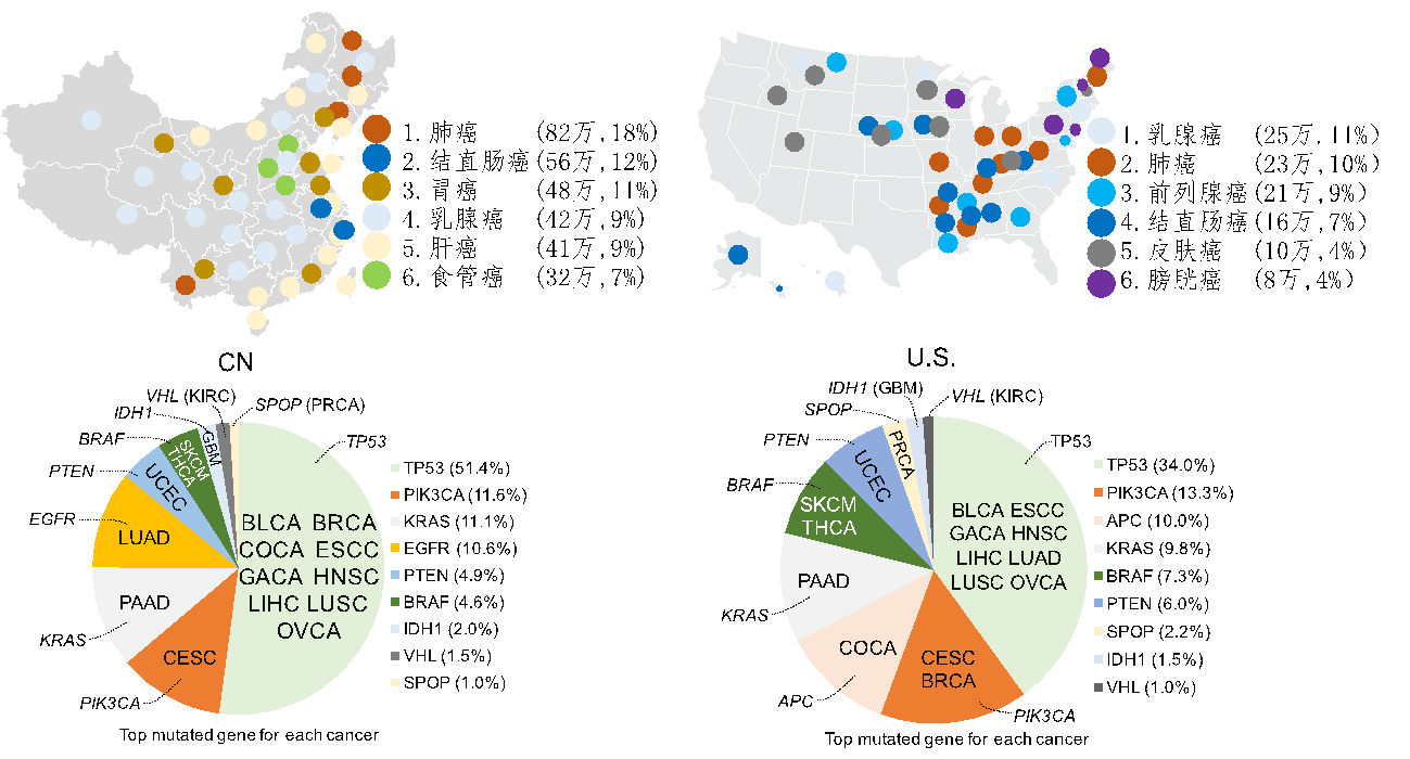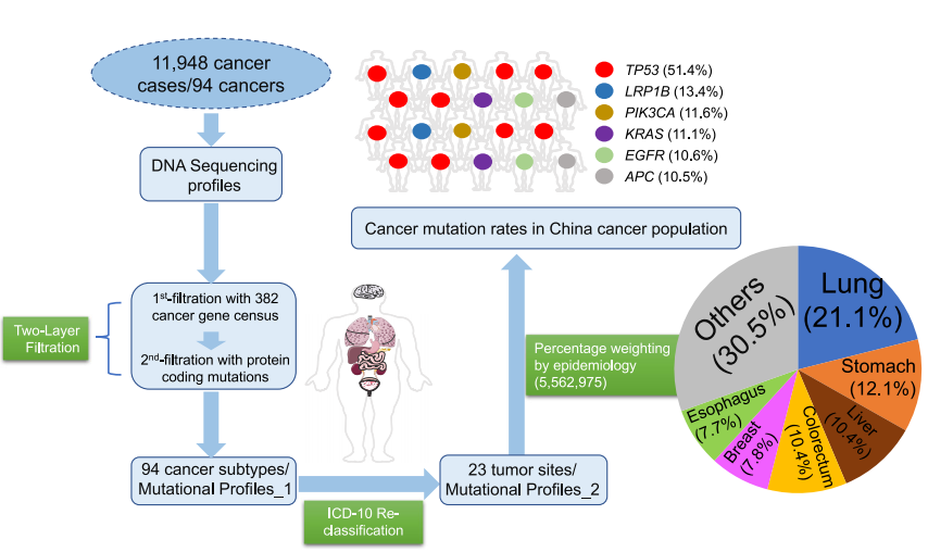 该研究收集并整理分析了2004年至2016年中国国家癌症中心共556万的癌症流行病学数据。文中分析了23种癌症类型(共包括94种肿瘤亚型,11,948例癌症患者)中382个肿瘤相关基因中可影响编码蛋白序列的基因突变。通过把肿瘤基因测序数据与流行病学数据进行融合分析,得出在中国癌症人群中排名前十的突变基因为TP53 (51.4%),LRP1B(13.4%),PIK3CA (11.6%), KRAS (11.1%), EGFR (10.6%), APC (10.5%), KMT2D (9.7%), KMT2C (8.8%), ARID1A (8.4%), and FAT4 (7.7%)。其中在中国人群中突变频率最高的基因为TP53 (51.4%),即超过一半的癌症患者的肿瘤组织携带有TP53突变。通过对中国的突变频率与美国的癌症基因突变频率进行对比分析发现,中国癌症患者TP53 (51.4%) 及 EGFR (10.6%) 等癌症基因的突变频率要远高于美国肿瘤患者的TP53 (34.0 %) 及 EGFR (3.1%)突变频率。通过分析发现TP53的差异主要是来自于中国的非小细胞肺癌,胃癌,食管癌,及肝癌中TP53的高突变率。该研究通过性别及吸烟状态的分层分析,发现EGFR的差异则主要来自于肺癌EGFR的高突变率,其中中国非吸烟女性的肺癌患者中EGFR的突变频高达70.7%。
