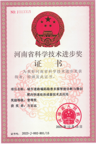 《城市道路塌陷隐患多源智能诊断与微创靶向快速处治成套技术及应用》项目由pp电子官方网站水利与交通学院方宏远教授主持,主要完成人有胡群芳、王念念、马保松、李策、王飞、李斌、曹鼎峰、项芒、赵继成、朱龙晖、宋有聚、何伟、赵鹏和冯磊等人。主要完成单位为pp电子官方网站、同济大学、中山大学、中国矿业大学(北京)、深圳安德空间技术有限公司、深圳飞扬骏研新材料股份有限公司、北京北排建设有限公司、深圳市施罗德工业集团有限公司、郑州安源工程技术有限公司和坝道工程医院(平舆)。该项目荣获2023年度河南省科学技术进步奖一等奖。