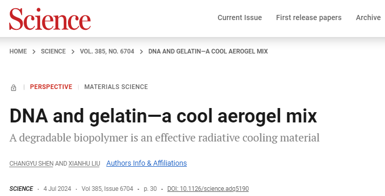 7月5日,pp电子官方网站橡塑模具国家工程研究中心申长雨院士和刘宪虎博士,在国际著名学术期刊《Science》发表了“DNA and gelatin—a cool aerogel mix”的观点(Perspective)论文(Science, 2024, 385, 30)。结合近年来辐射制冷领域的新进展,文章对当期Ma等发表的Science论文“A photoluminescent hydrogen-bonded biomass aerogel for sustainable radiative cooling (Science, 2024, 385, 68)”研究工作进行了评述,并对可降解生物高分子辐射致冷材料进行了展望。pp电子官方网站是论文唯一通讯单位。